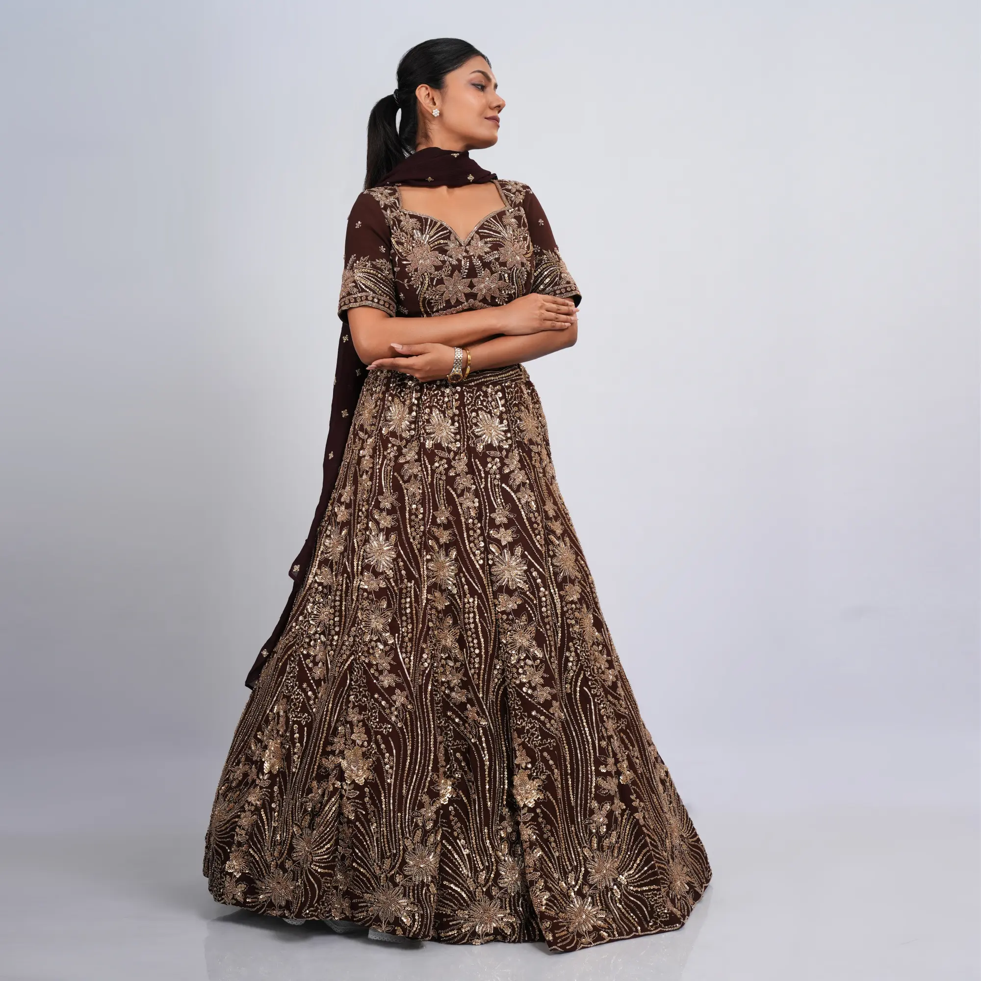 The Skirt: The high-waisted A-line skirt is crafted from a premium, high-shine champagne gold fabric that catches the light with a soft metallic glow. Its minimalist construction features smooth, clean panels that flow into a structured floor-length flare, beautifully balancing the intricate texture of the top.