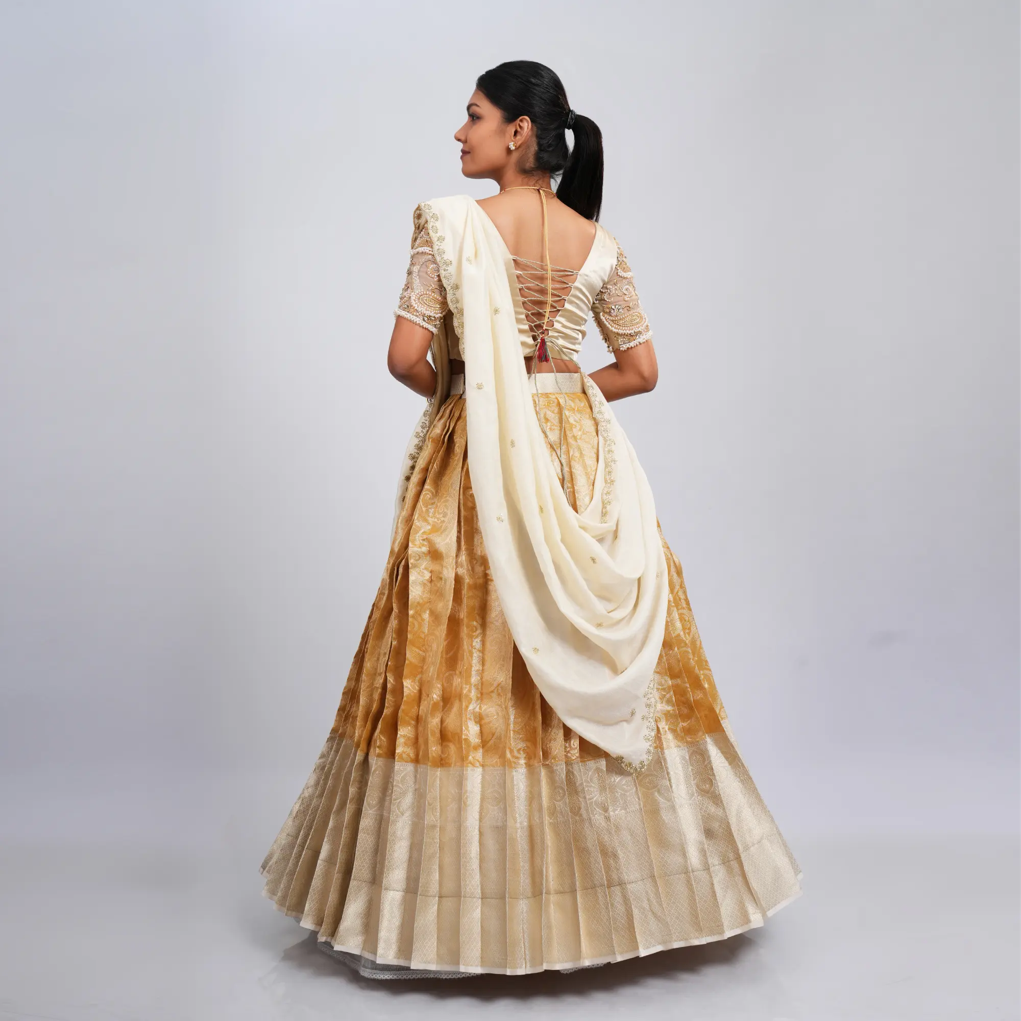 • Design Detail: Halter-style choli with a chevron-pleat pattern and a signature midriff cutout.