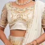• The Vibe: Moving away from traditional embroidery, this set relies on form and texture to make a statement, offering a fresh, “cool-girl” alternative for modern wedding receptions or glamorous cocktail evenings.