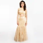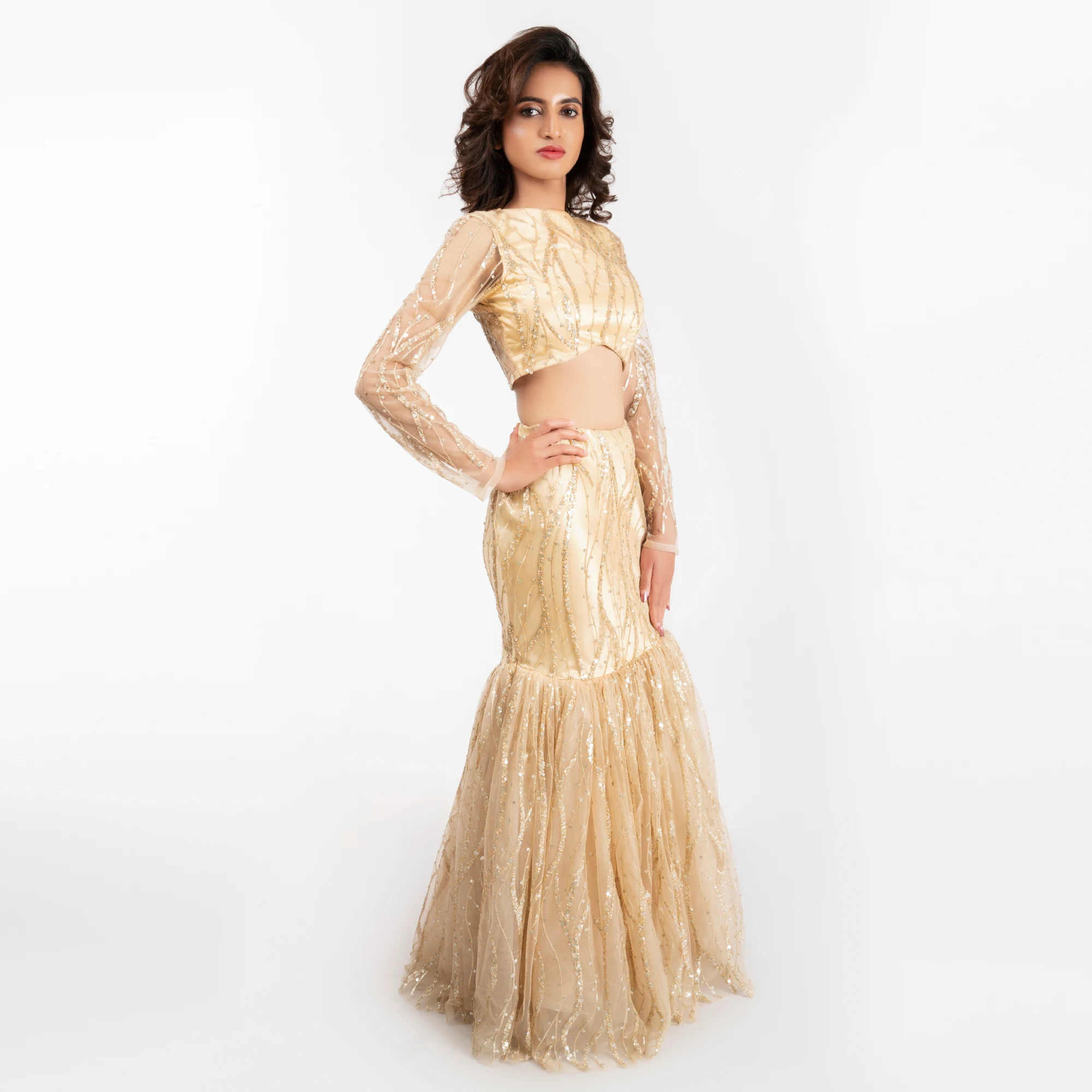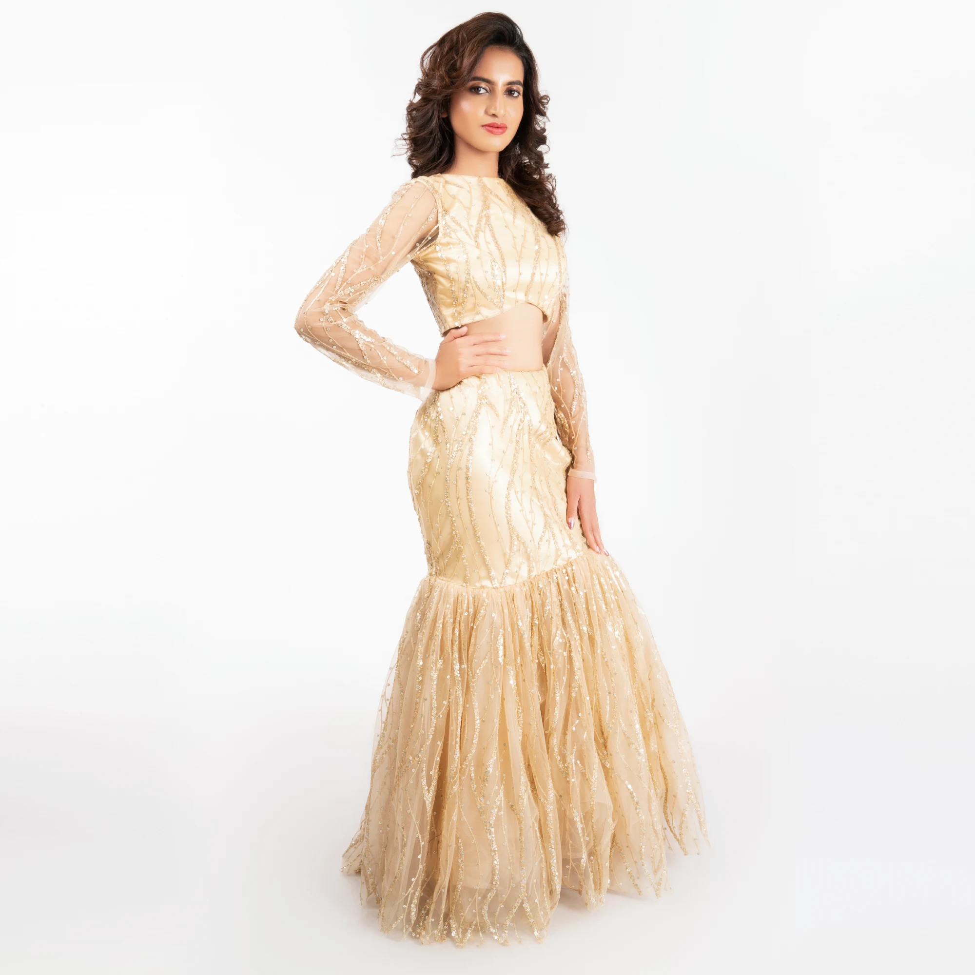 Step away from tradition and into the spotlight with our Champagne Gold Mermaid Set. This custom-made ensemble is designed for the woman who wants to blend the elegance of an evening gown with the playful spirit of a lehenga.