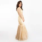 Care Instructions: Professional dry clean only. Store hanging in a garment bag to maintain the shape of the mermaid flare and prevent sequin snagging.