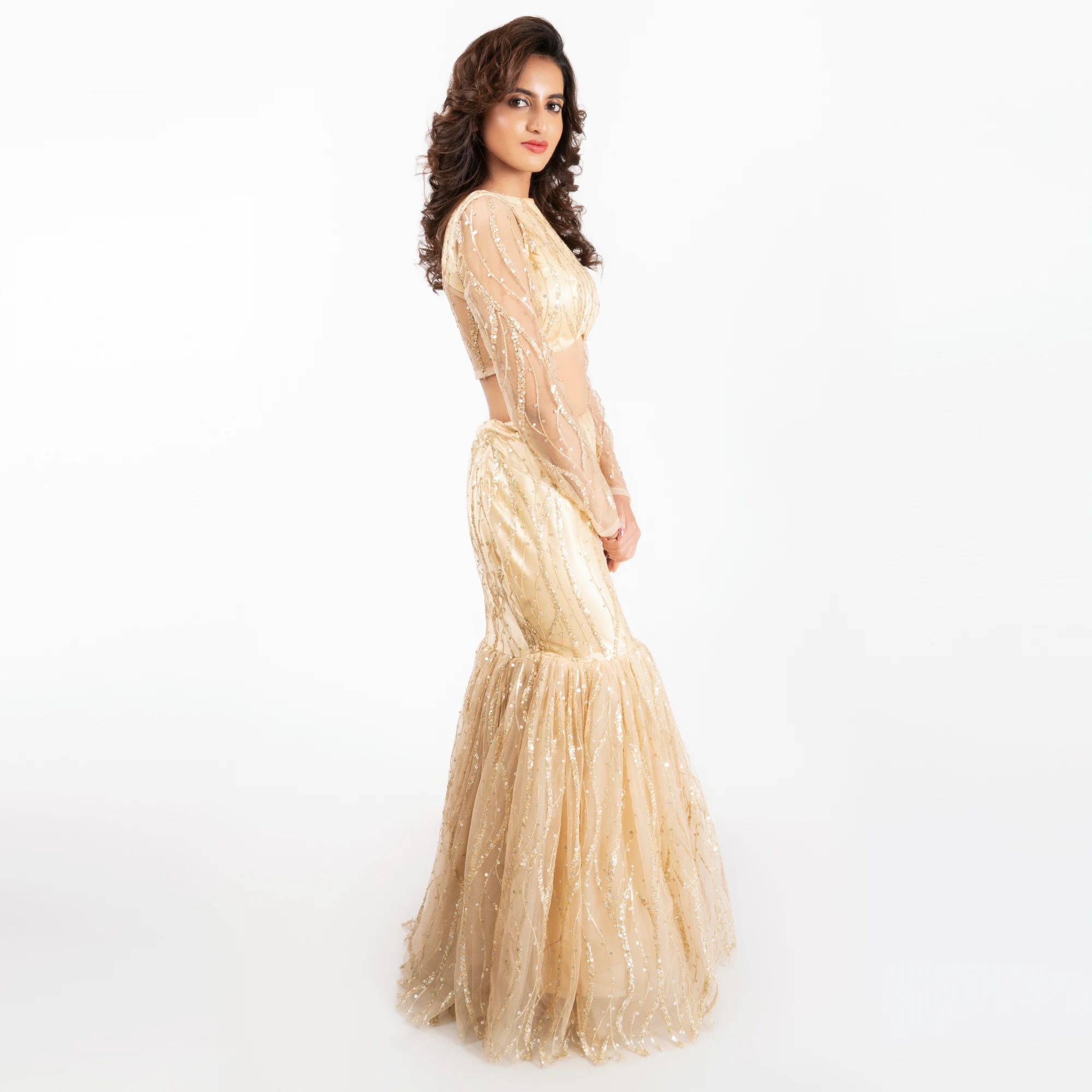 The Mermaid Skirt: This unique skirt is tailored for a bodycon fit through the waist and thighs to accentuate the natural silhouette. At the knee, the fabric transitions into a voluminous mermaid-style flare made of multiple layers of soft tulle and net. The sequin patterns flow seamlessly down the length of the skirt, creating a cohesive, elongated look.