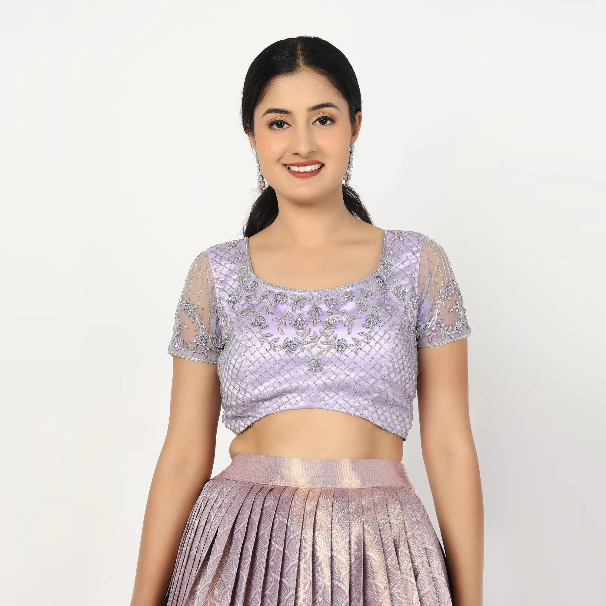 The Blouse (Choli): The bodice is crafted in a soft lavender hue with a classic round neckline. It features sheer, elbow-length sleeves adorned with a delicate diamond-lattice (jali) hand-embroidery and floral motifs, adding a refined, crystalline texture to the look.