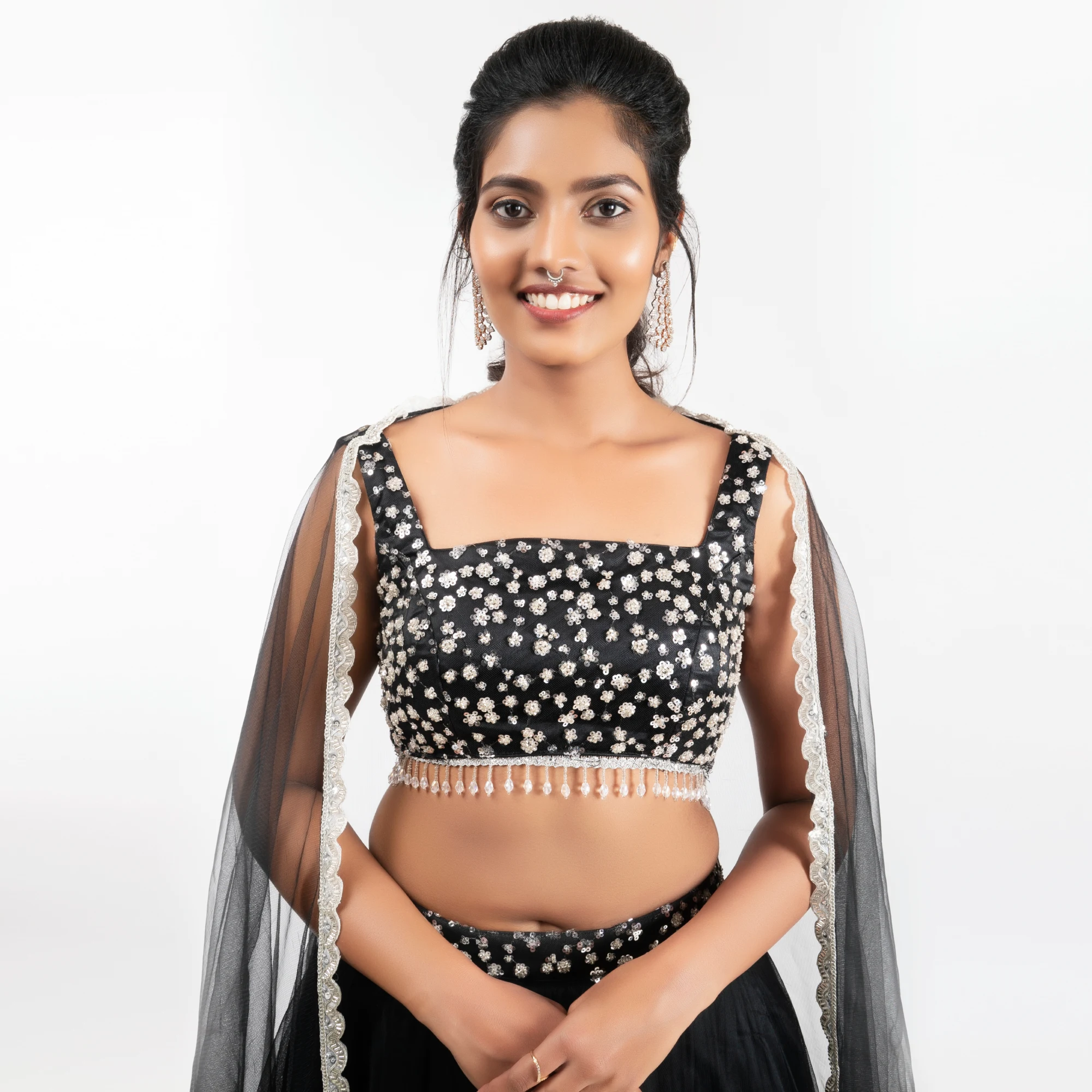 Make a bold statement in this contemporary Midnight Black Net Lehenga. Featuring a sleeveless blouse meticulously embroidered with white floral motifs and finished with a delicate pearl-drop fringe, paired with a voluminous layered net skirt and a scalloped-edge dupatta. An ideal choice for cocktail parties, sangeets, or modern evening celebrations.