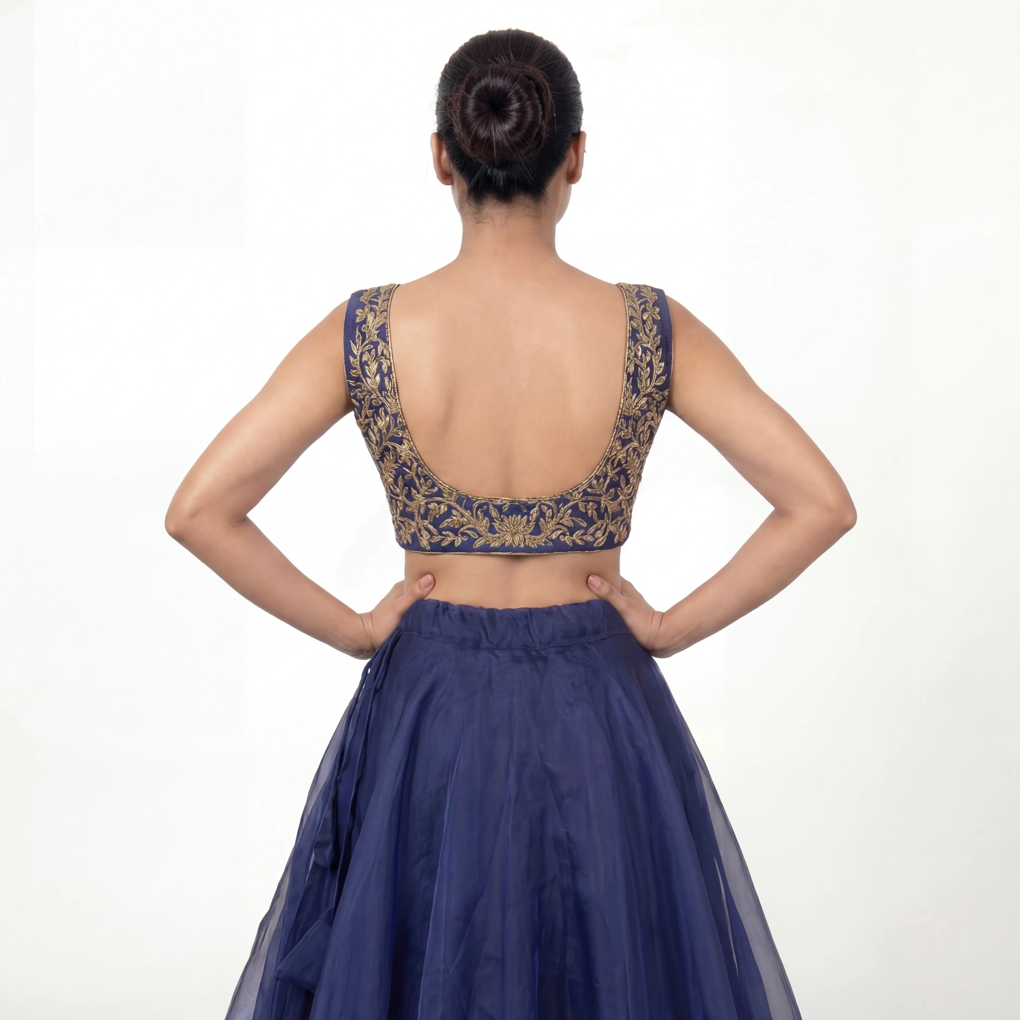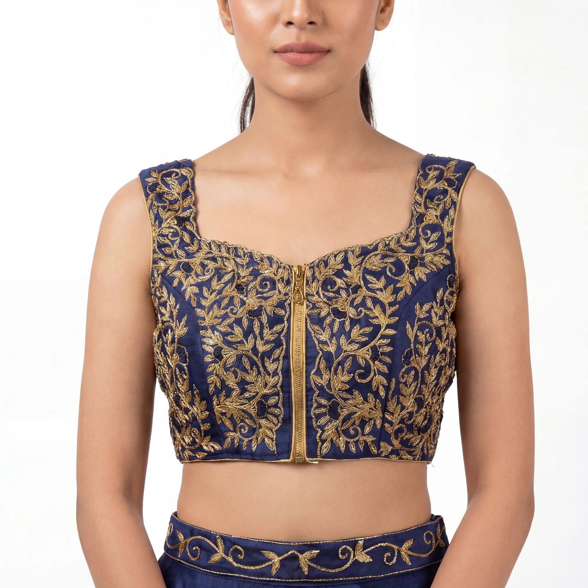 The Choli (Crop Top): The top is the centerpiece of this ensemble, crafted on a deep midnight blue base. It features dense gold zari and thread embroidery in an intricate floral-vine motif that covers the entire front. The sleeveless design and elegant neckline are complemented by a functional gold-toned front zipper, adding a modern, industrial touch to the traditional craftsmanship.