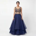 The Lehenga (Skirt): The floor-length skirt is designed for drama and movement. It is made from three distinct layers of sheer fabric (likely organza or georgette), creating a tiered circular flare that catches the light beautifully. The waist is highlighted by a matching embroidered belt, ensuring a cohesive and polished transition from the heavy bodice to the light, airy skirt.