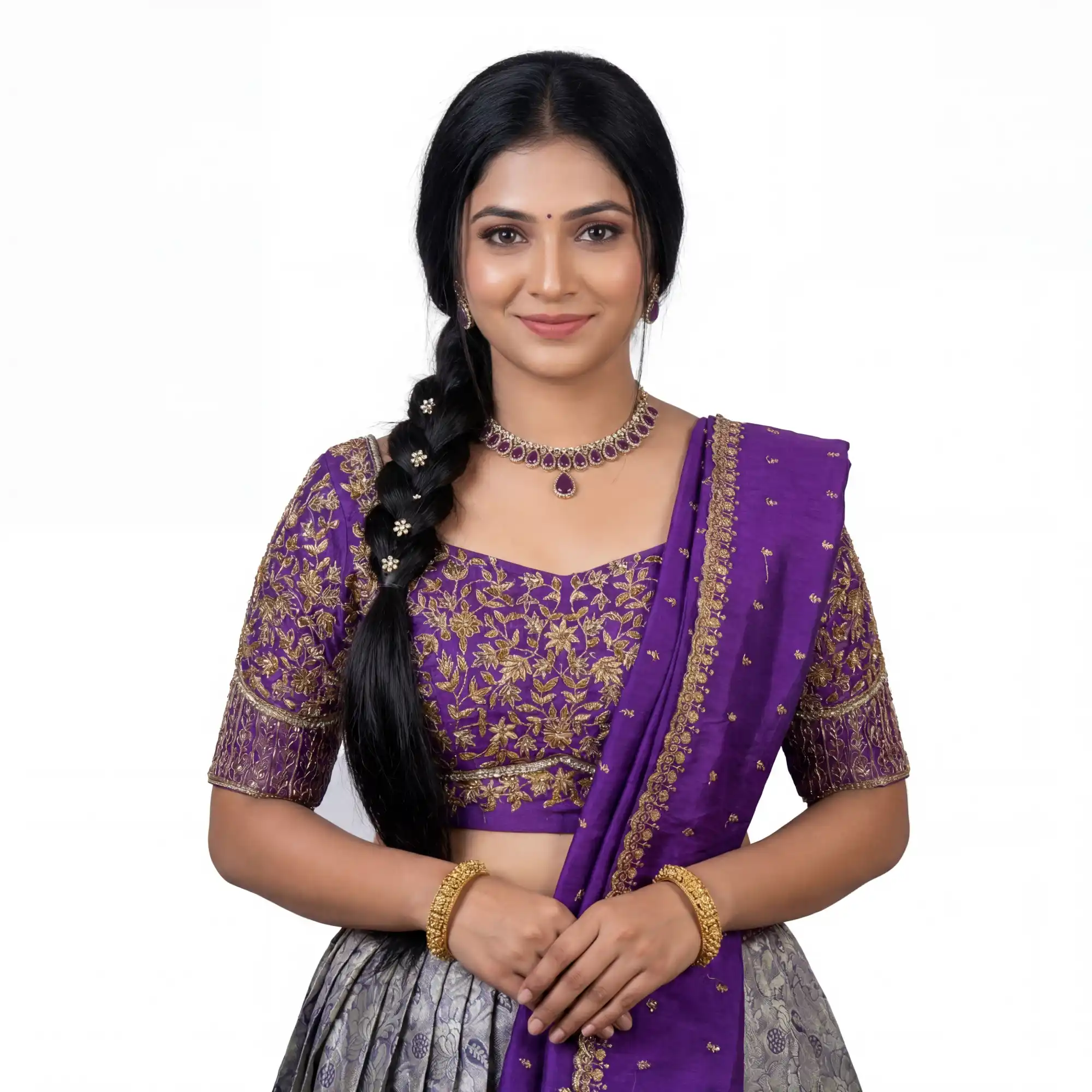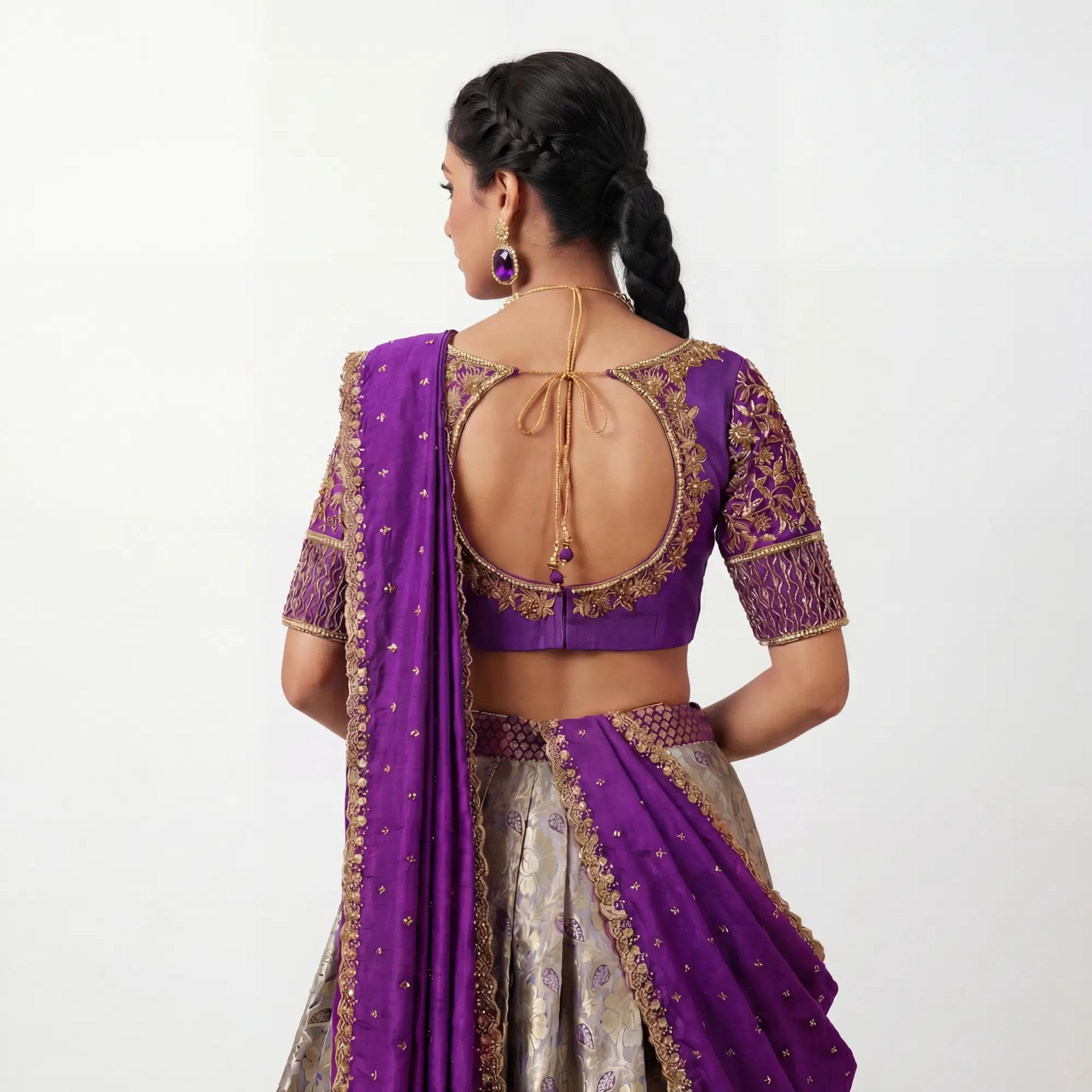 The Blouse (Choli): The deep purple blouse features a classic U-neckline and elbow-length sleeves, both heavily adorned with gold floral vines and intricate threadwork that provides a luxurious texture.