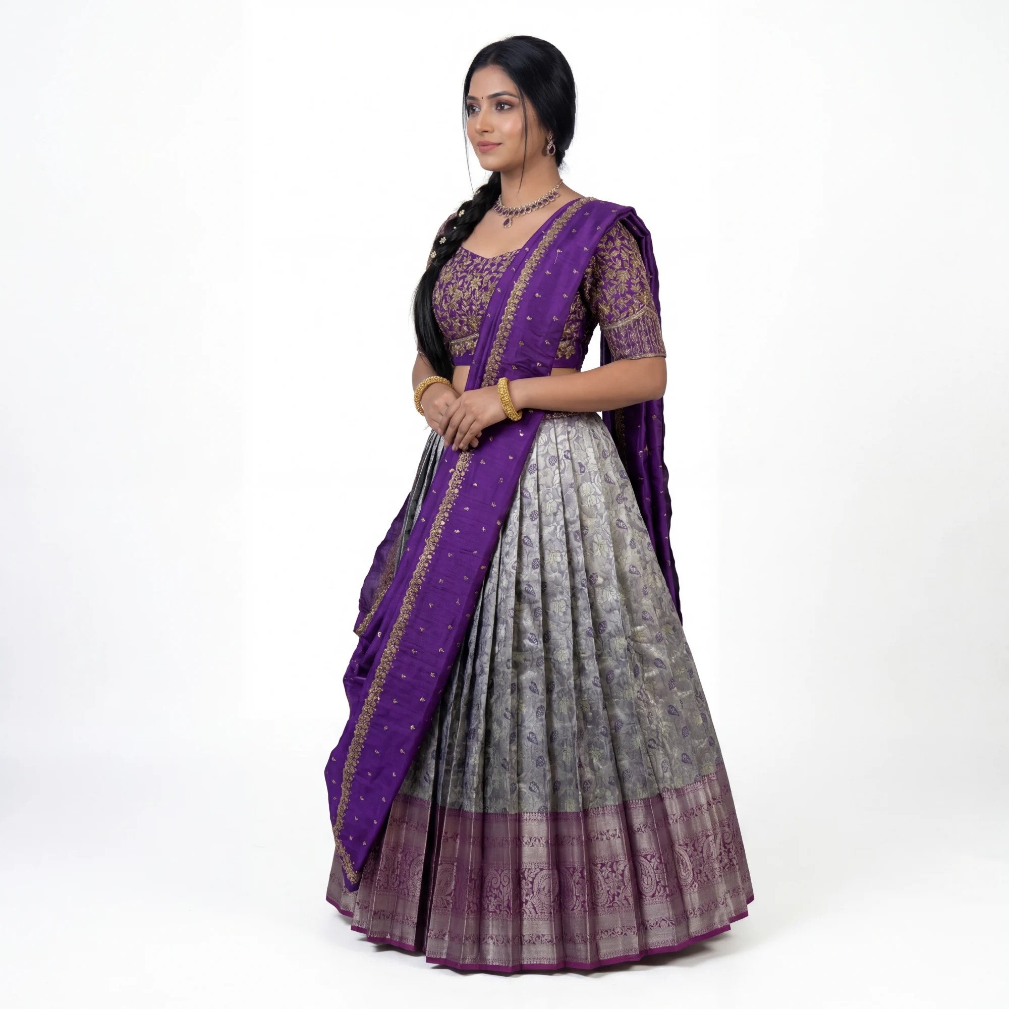 The Lehenga (Skirt): The skirt is crafted from silver-grey brocade silk with subtle purple undertones, featuring an all-over floral motif. It is anchored by a heavy purple and gold zari border at the hem, showcasing traditional temple-inspired patterns.
