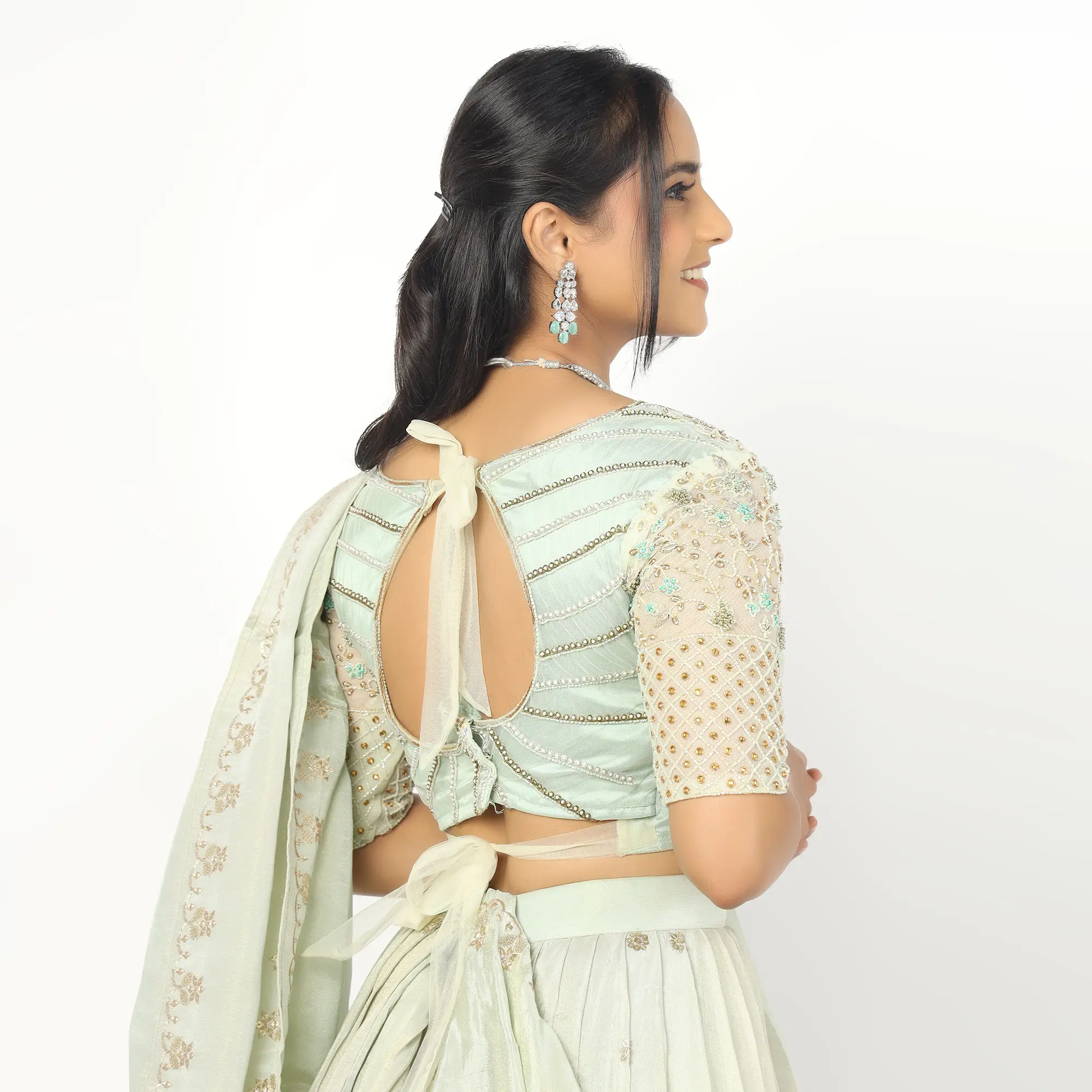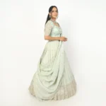 The Seafoam Mint Beaded Lehenga Set is a study in understated luxury, designed to offer a luminous presence at high-profile festive events.