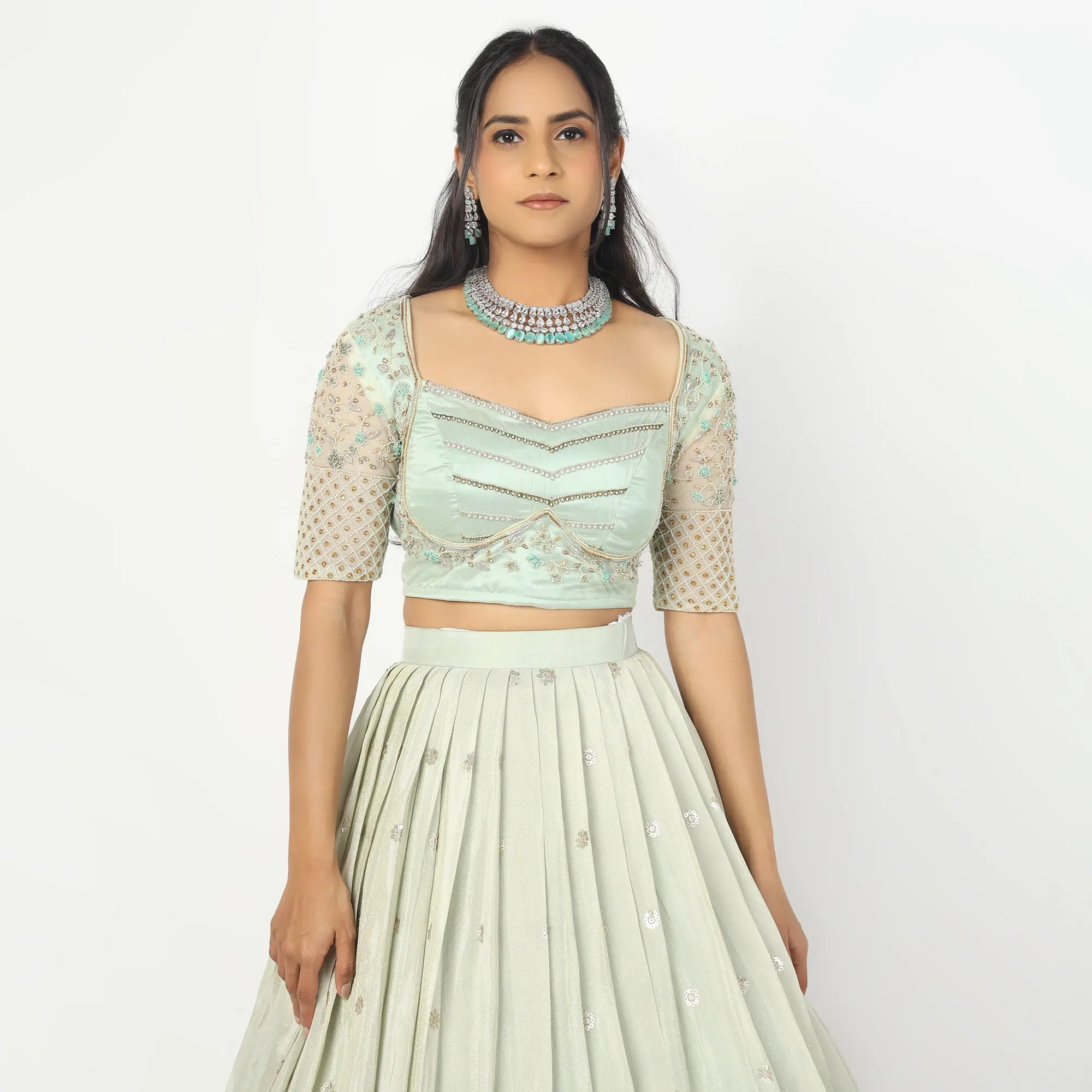 The Lehenga (Skirt): The high-waisted flared skirt is crafted from premium silk-blend fabric in a soft mint hue. It features vertical pleating that leads into a heavily embroidered hemline, showcasing intricate floral and vine motifs in antique silver zari and sequins.