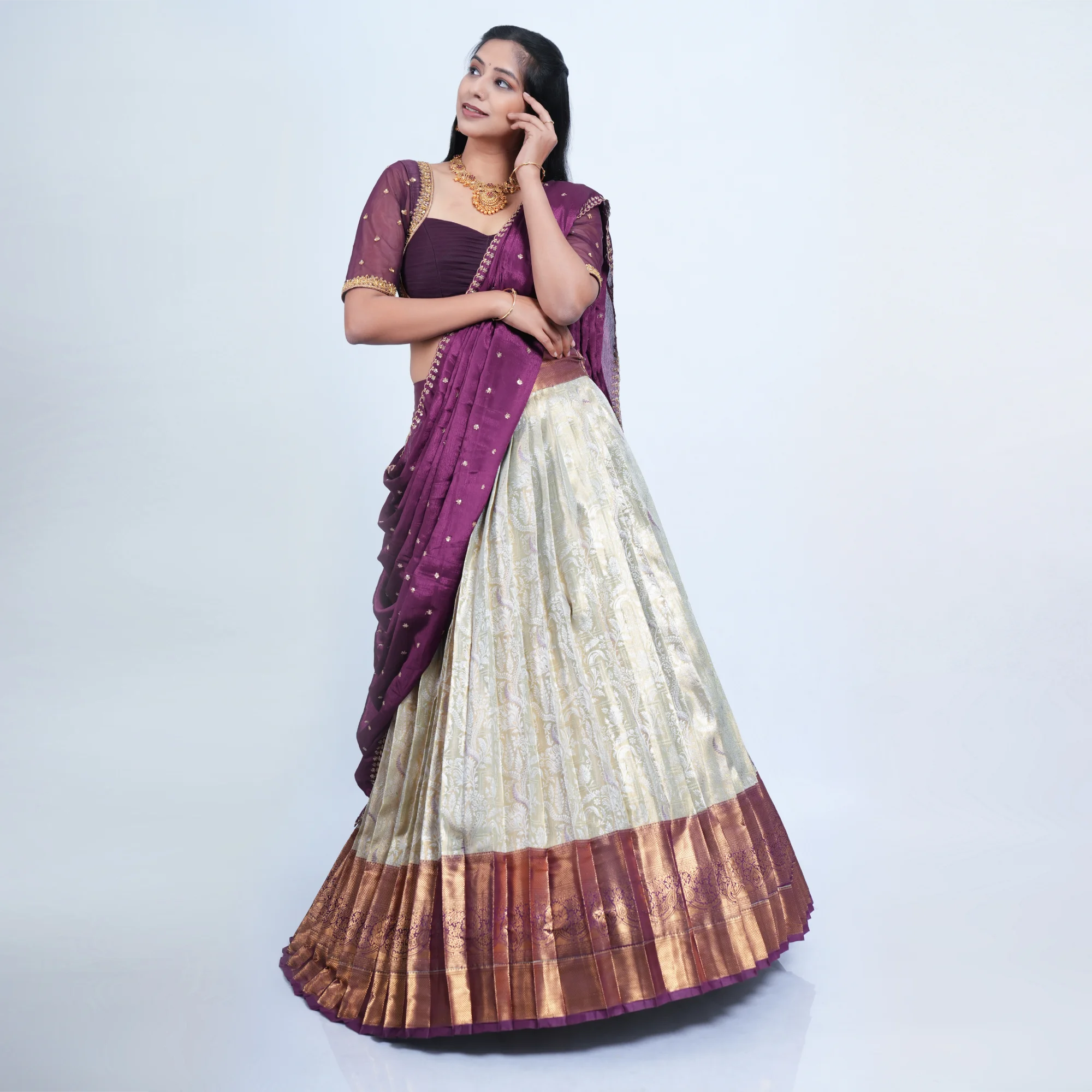 The Wine & Champagne Brocade Half Saree is a celebratory masterpiece designed to blend the richness of traditional South Indian textures with a sophisticated, modern color palette.