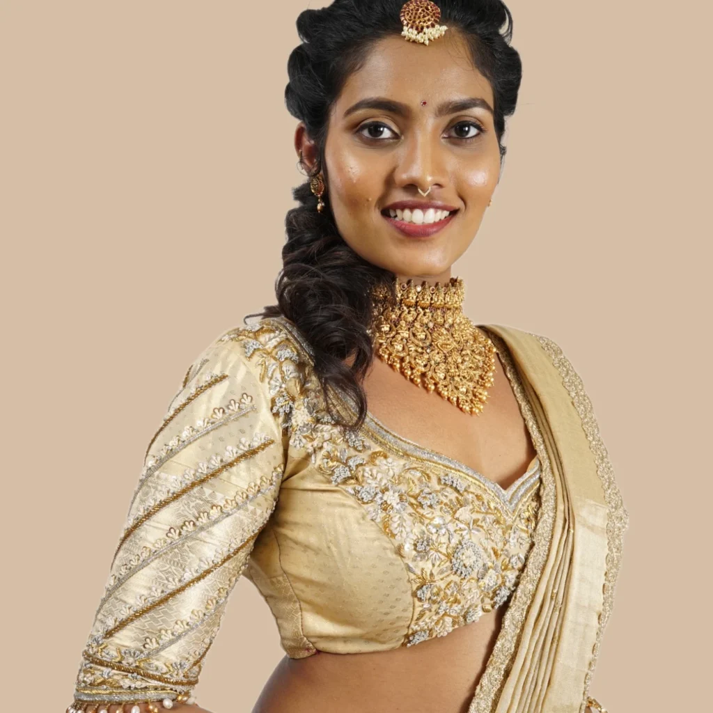 • Intricate Hand-Embroidery: We specialize in the timeless art of Zardosi, bullion knots, and delicate beadwork, transforming every blouse and choli into a wearable piece of art.