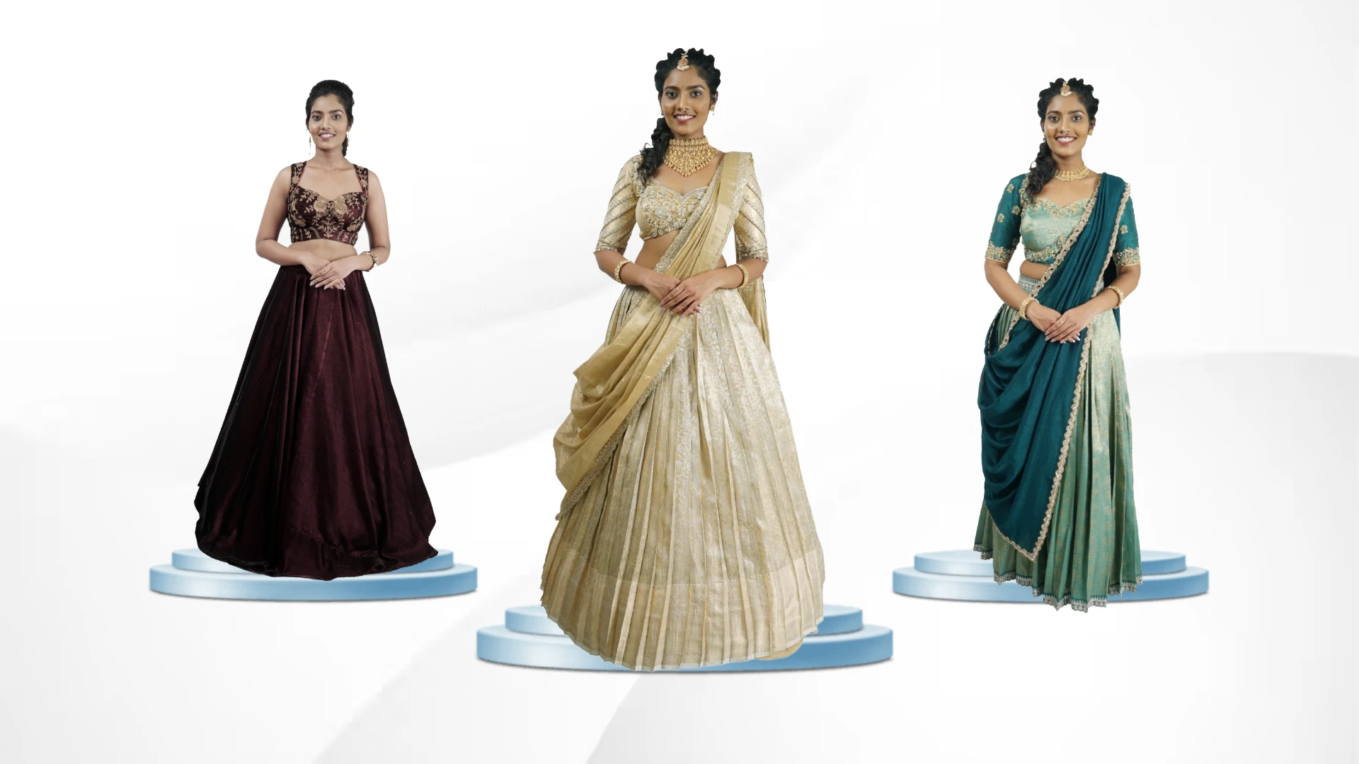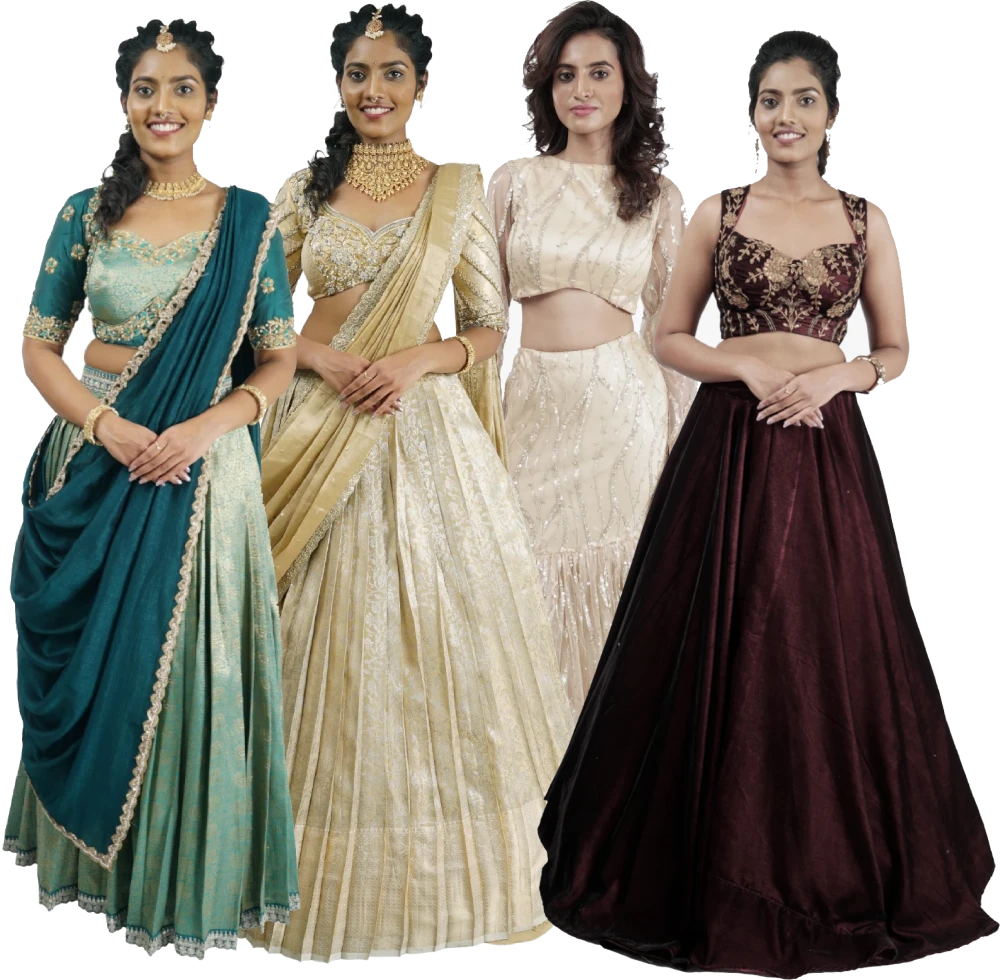 • Versatile Design Language: Our collections are designed to take you from a traditional morning ceremony in a brocade half saree to an evening gala in a sleek, sequined fusion set.