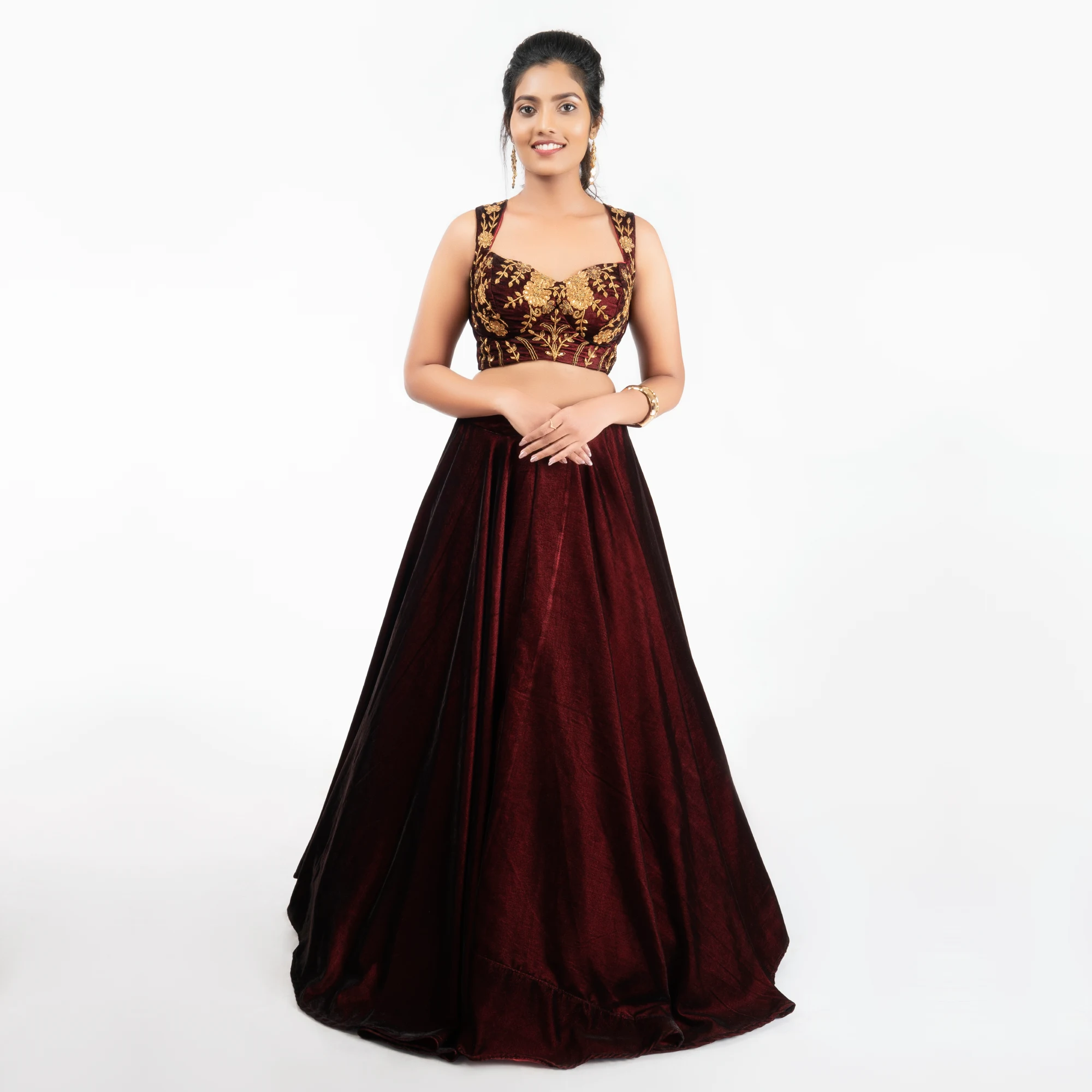 Royal Burgundy Velvet Lehenga Set – Hand-Embroidered Floral Choli & Flared Skirt