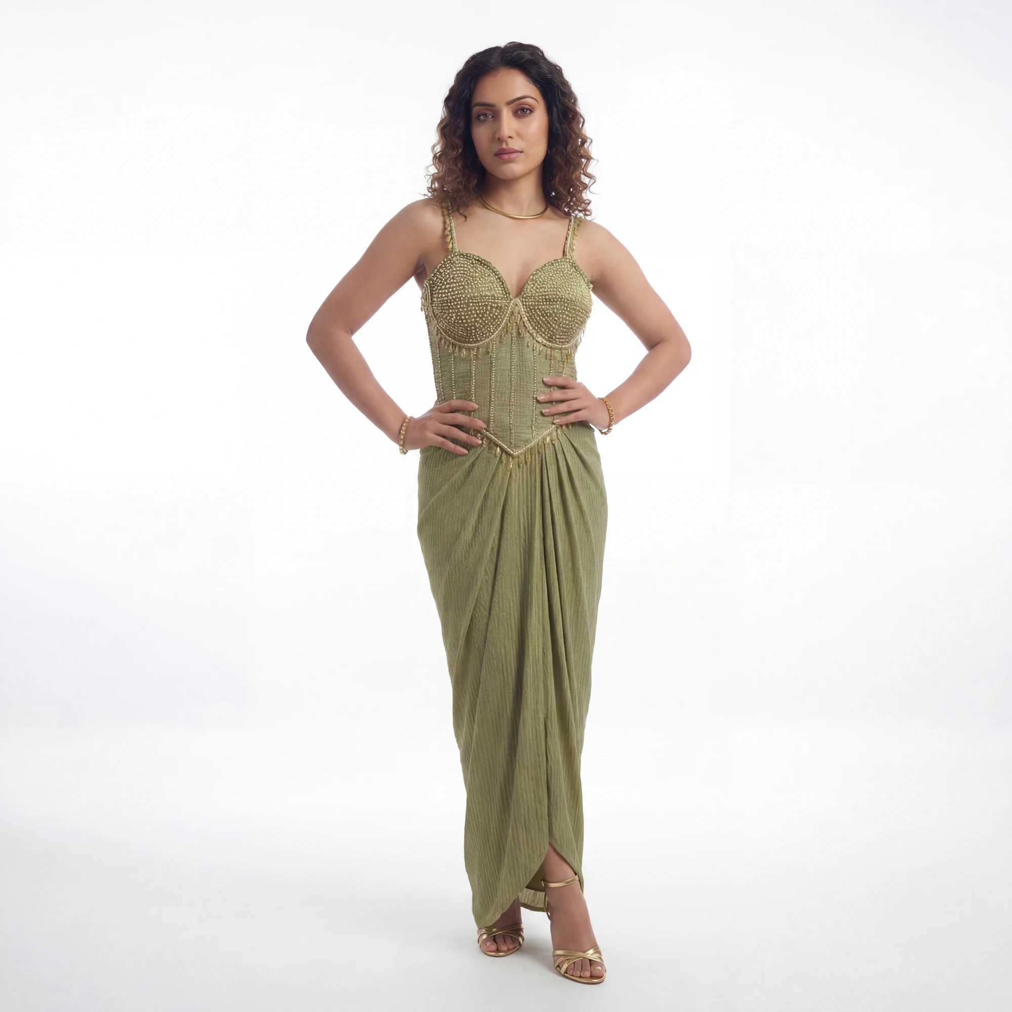 Sage Gold Embellished Bustier Draped Set – Corset-Style Bodice with Pearl-Fringe Detailing