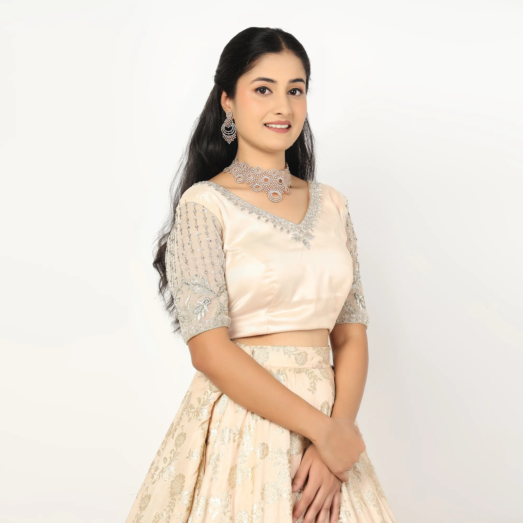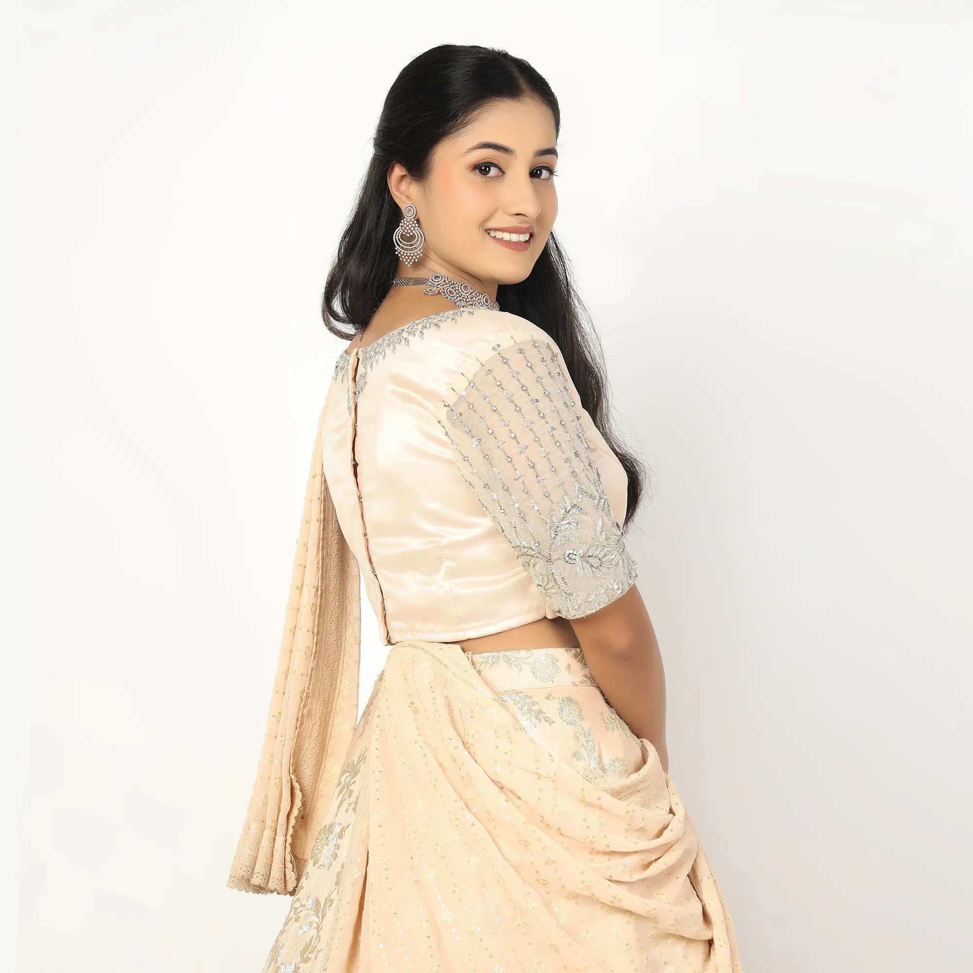 • The Blouse (Choli): The bodice features a classic V-neckline and sheer, elbow-length sleeves. The sleeves are intricately hand-embellished with silver and gold beadwork in a delicate linear and geometric pattern, while the neckline is framed by a shimmering embroidered border.