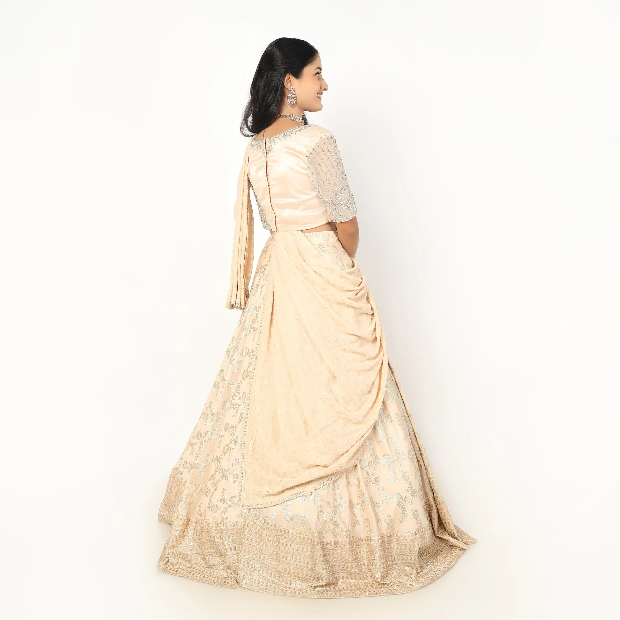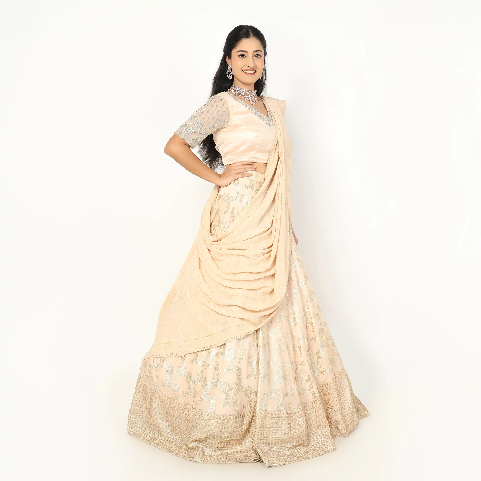 Champagne Cream Brocade Lehenga Set – Hand-Embroidered Zari & Floral Festive Ensemble