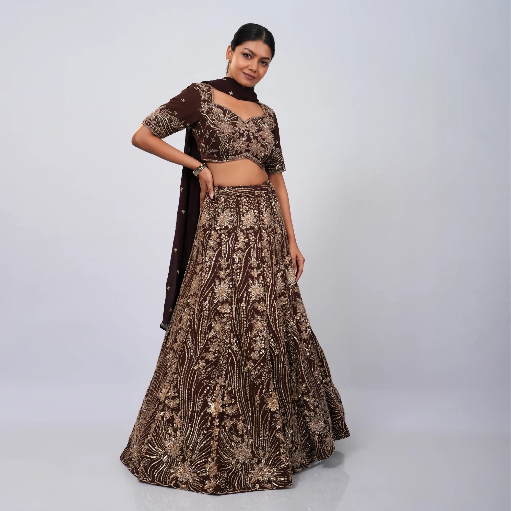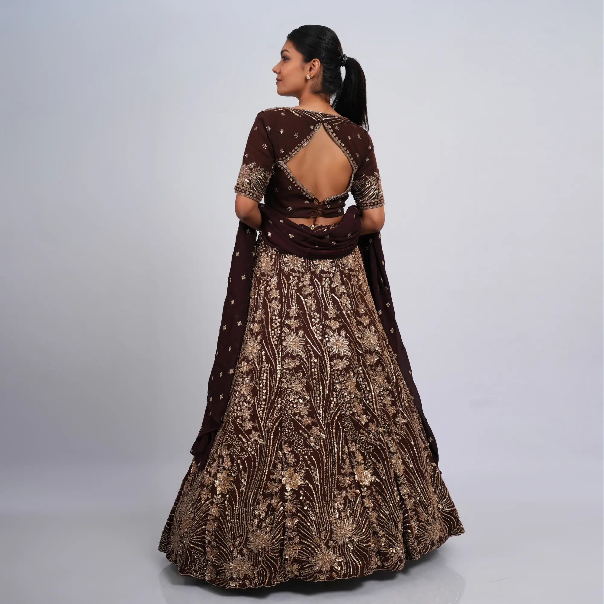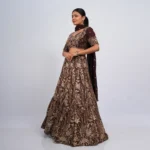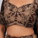 • Design Detail: Halter-style choli with a chevron-pleat pattern and a signature midriff cutout.