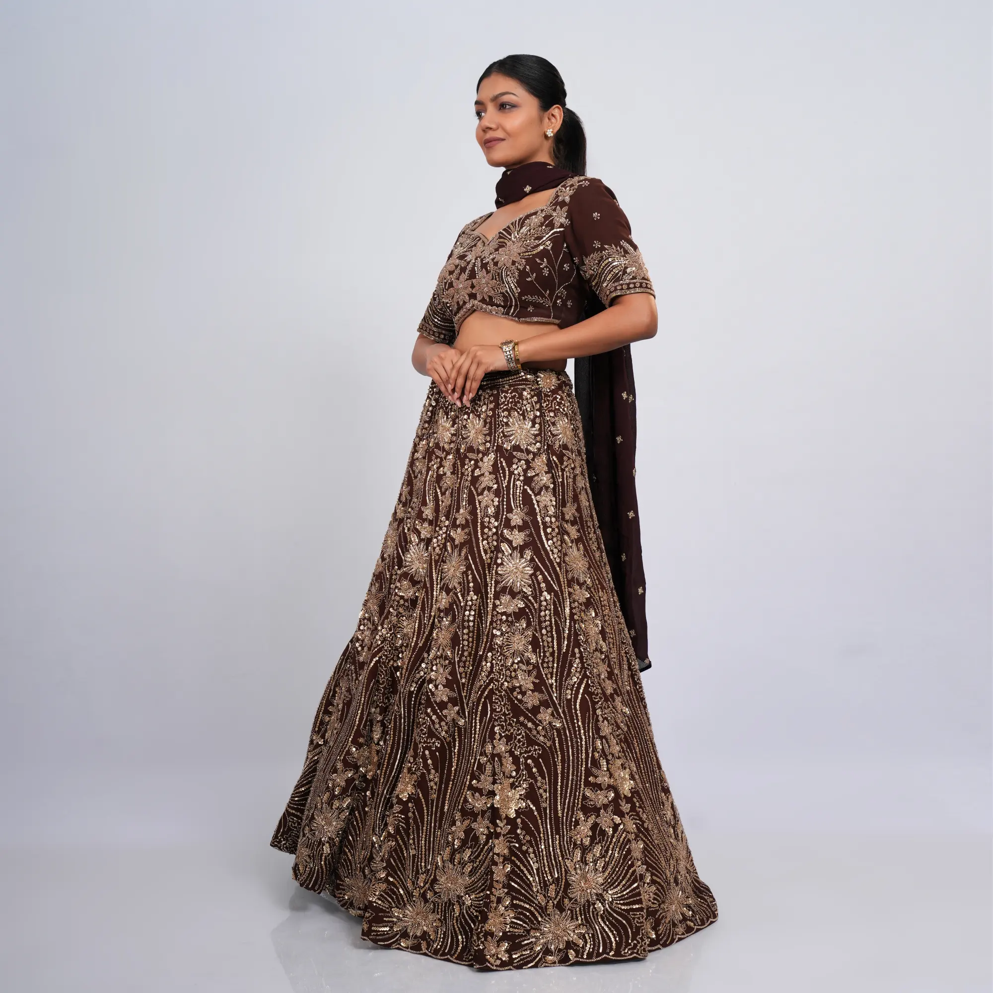 • The Bodice: The sleeveless halter-style choli is a masterwork of fabric manipulation, featuring dense, horizontal chevron-style pleating that creates a striking 3D texture. The design is centered by a sharp V-neckline and a modern inverted-V cutout at the midriff, adding an architectural edge to the bodice.