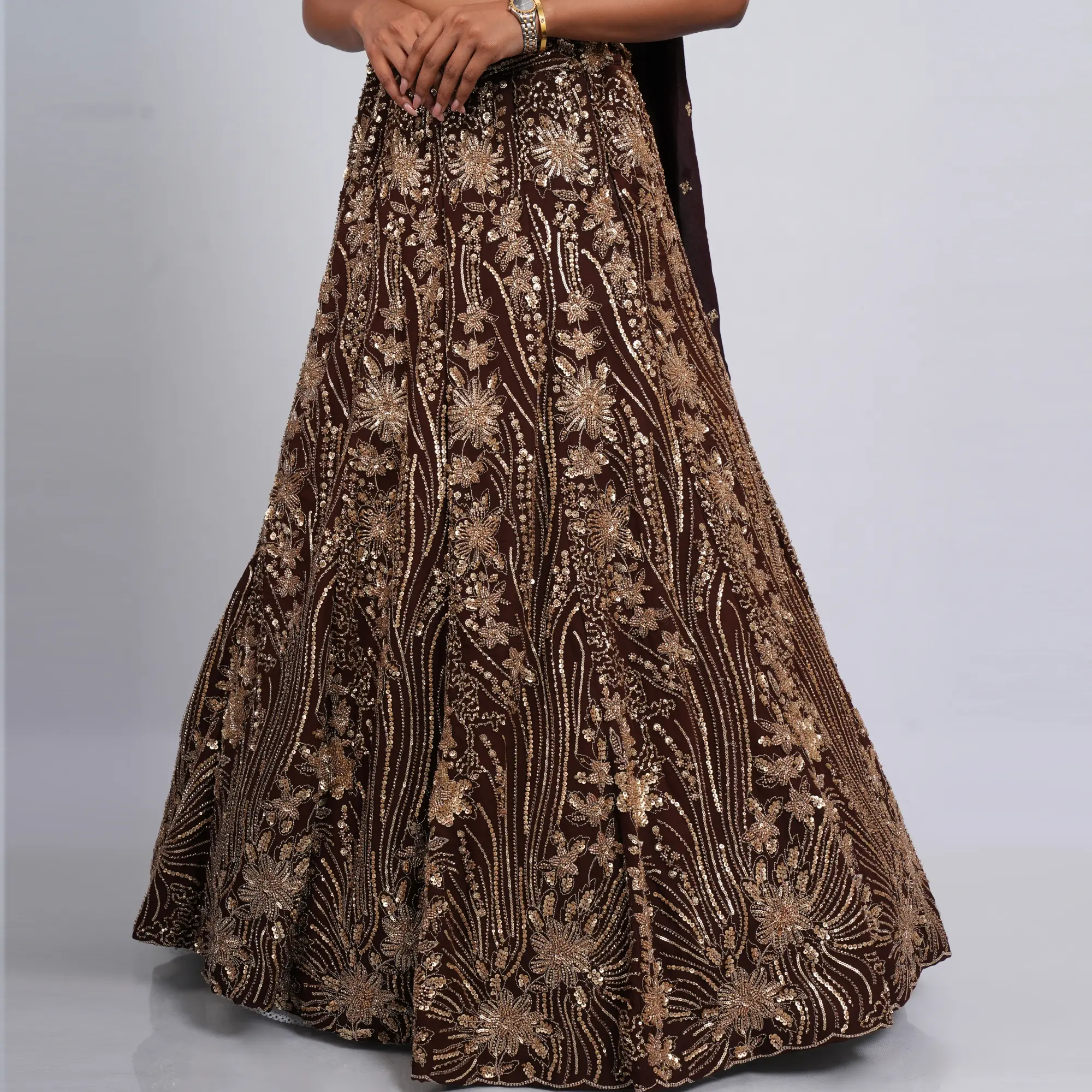 • The Skirt: The high-waisted A-line skirt is crafted from a premium, high-shine champagne gold fabric that catches the light with a soft metallic glow. Its minimalist construction features smooth, clean panels that flow into a structured floor-length flare, beautifully balancing the intricate texture of the top.