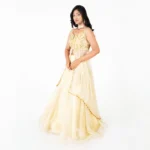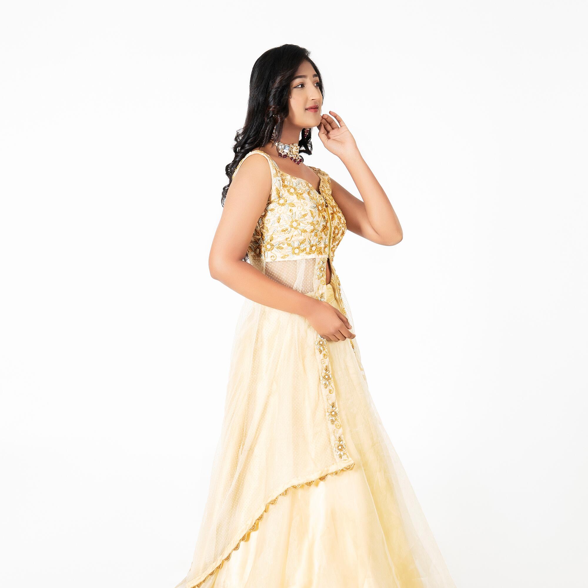 Radiate elegance in this cream-toned Indo-Western set, featuring a unique front-slit bodice with heavy gold floral zari embroidery and a voluminous, flowing layered skirt.