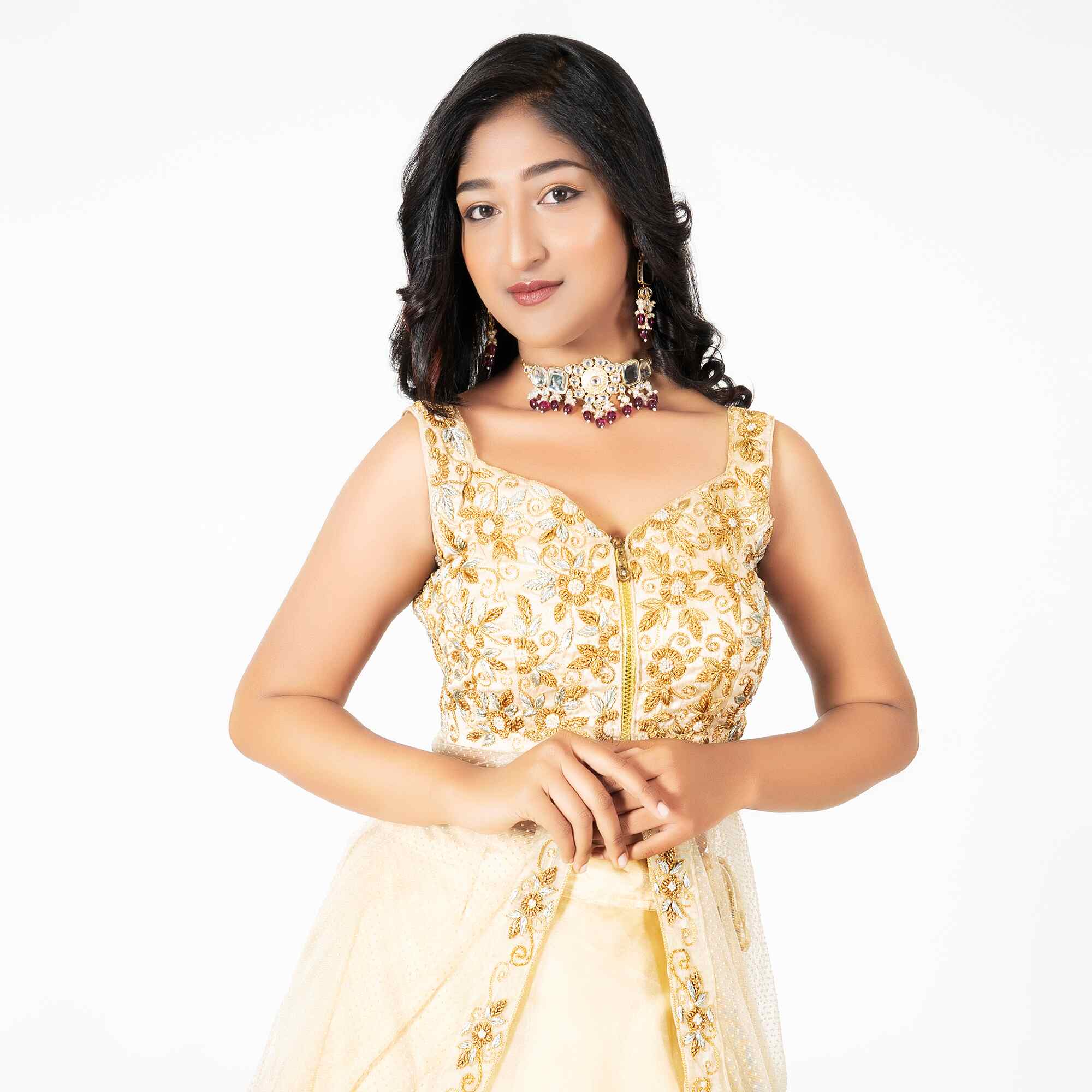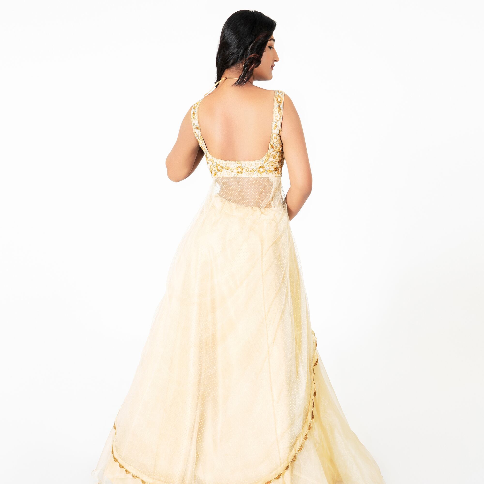 • The Lehenga (Skirt): The floor-length skirt is crafted from premium cream-toned fabric with multiple layers of fine sheer net, creating a voluminous and airy silhouette that moves gracefully with every step.