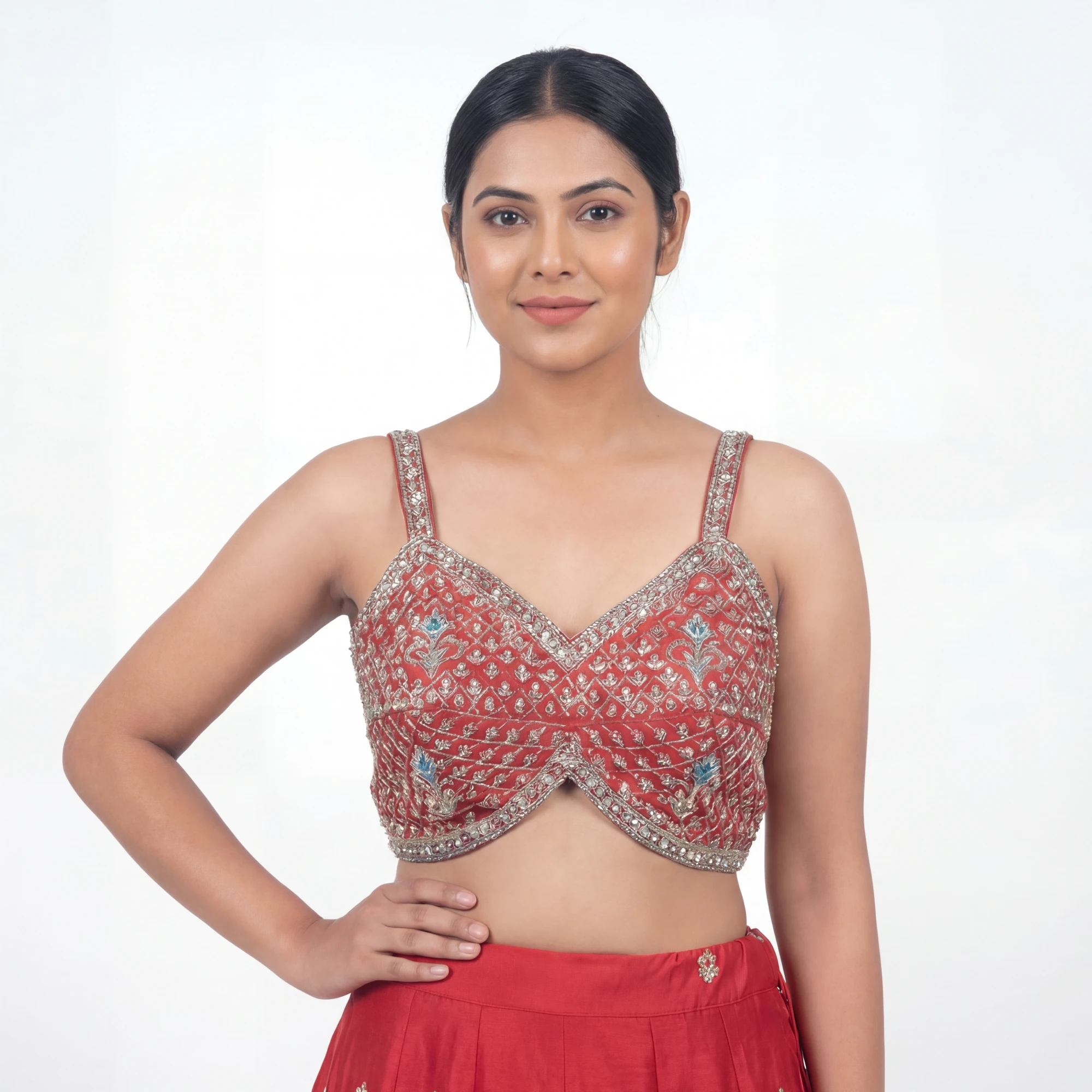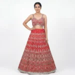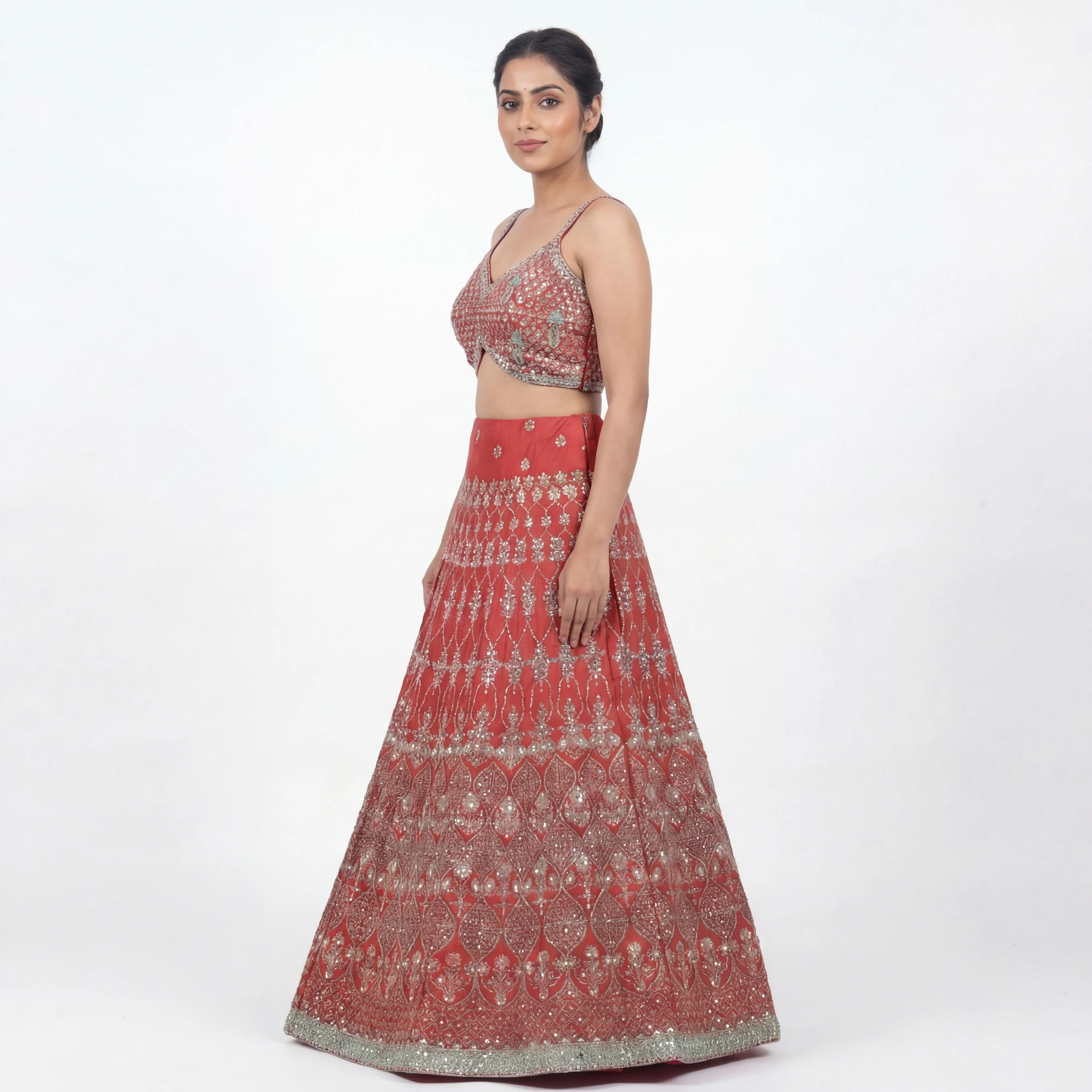 The Crimson Bloom Bridal Lehenga is an exquisite display of high-fashion craftsmanship, designed to be the centerpiece of a grand wedding celebration.