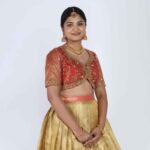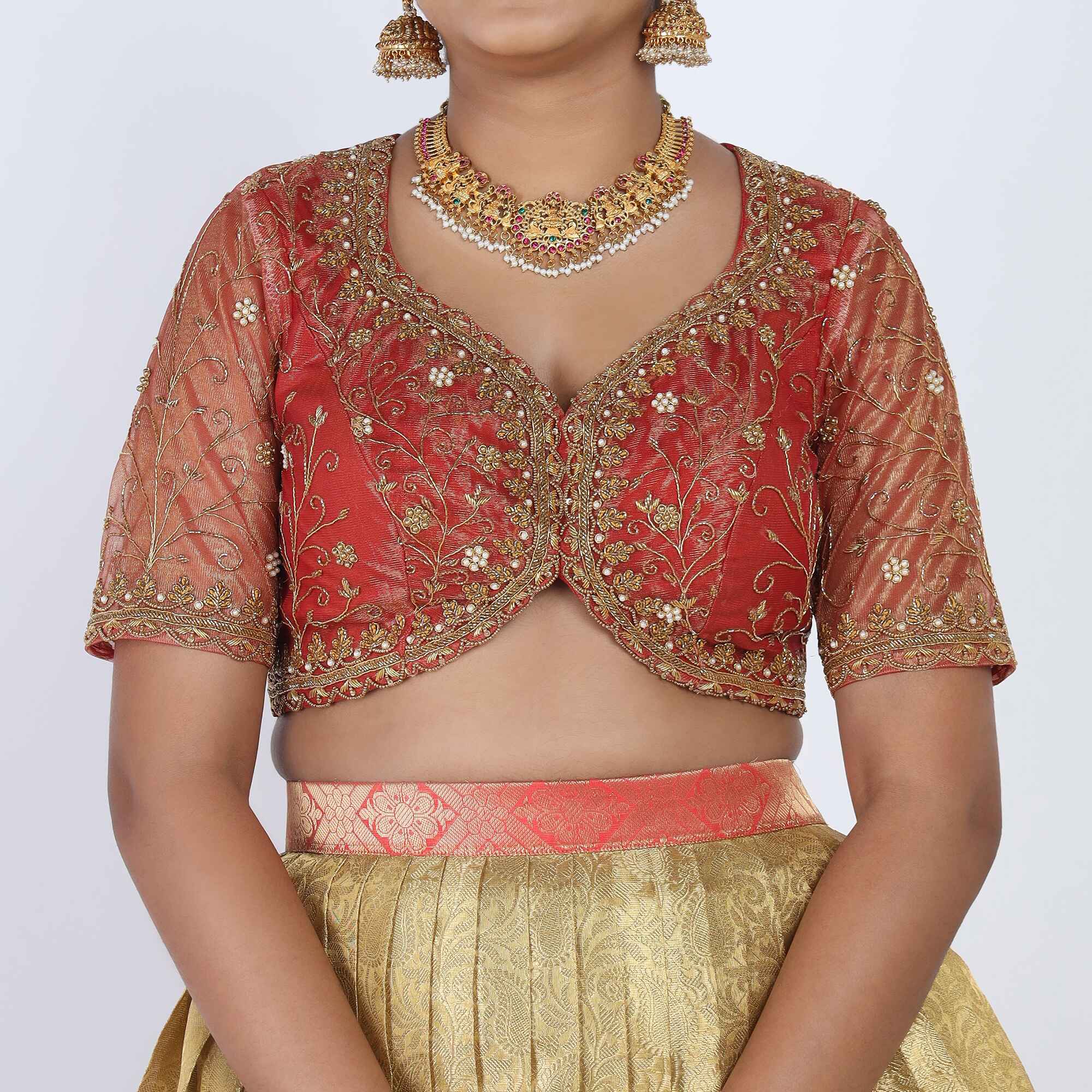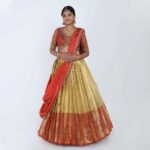 Fabric: Premium Brocade Silk for the skirt and raw silk-blend with sheer detailing for the choli.