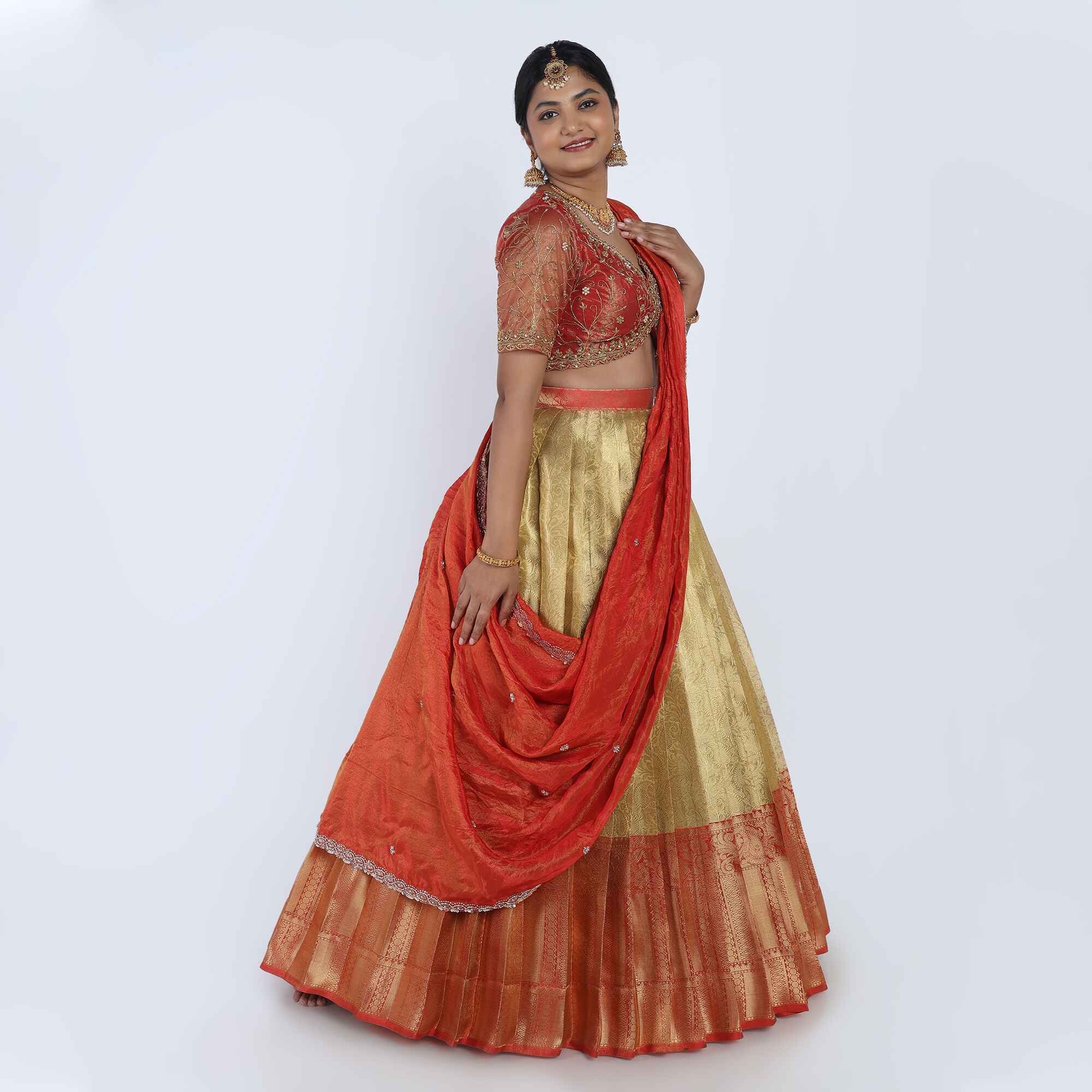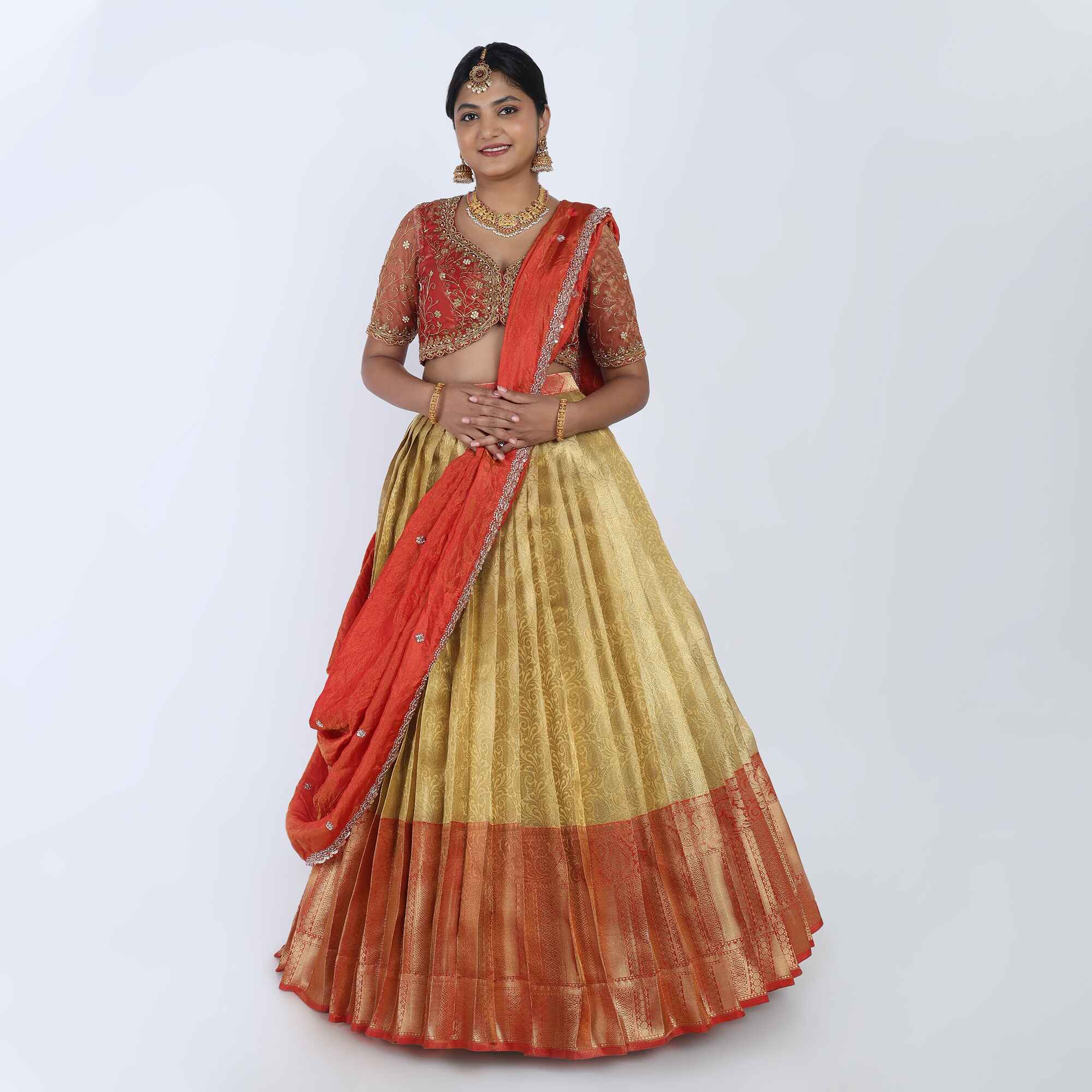 Occasion: Traditional Weddings, Half Saree ceremonies, and major festivals.