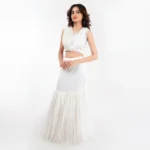 The Mermaid Skirt: The focal point of this ensemble is the high-waisted skirt. It is precision-fitted through the waist and hips to create a sleek, bodycon silhouette. At the mid-thigh, the skirt transforms into a dramatic mermaid flare made of multiple layers of soft, gathered tulle. This tiered effect adds a sense of romantic movement and “red carpet” drama to every step.