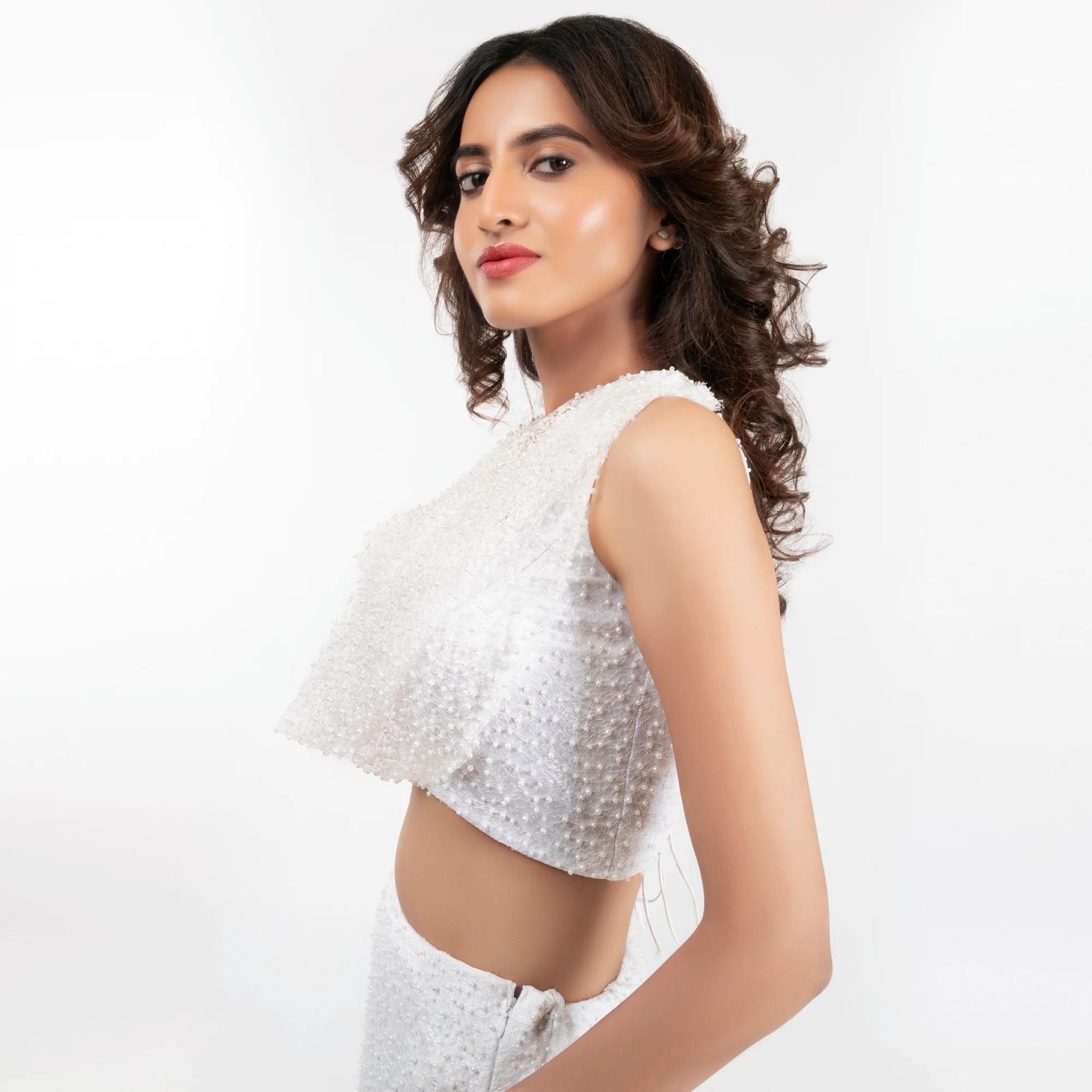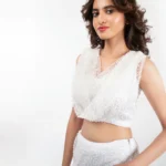 The Top (Choli): The top is a masterclass in clean tailoring. It features a sleeveless, wrap-style design with a flattering V-neckline that elongates the frame. Crafted from a premium textured fabric with a subtle sheen, the crop top provides a crisp, architectural contrast to the softness of the skirt.