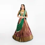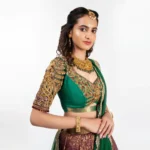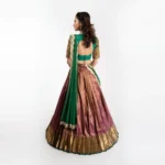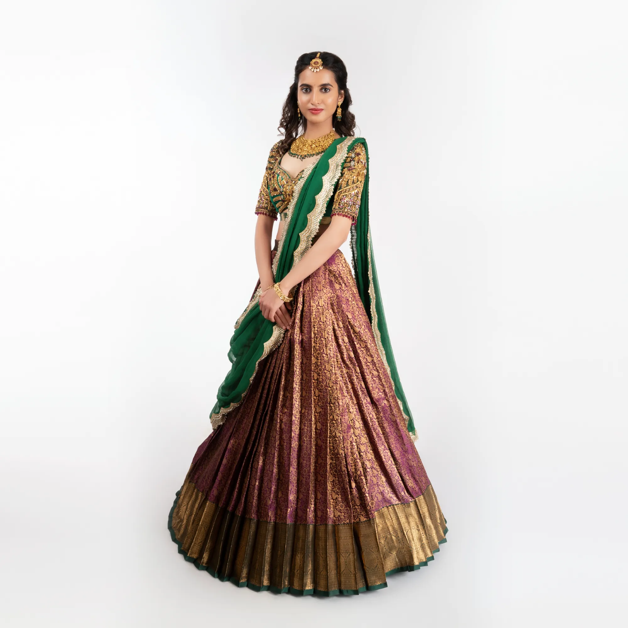 Fabric: Kanchipuram or Art Silk, characterized by its stiff, voluminous drape.