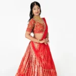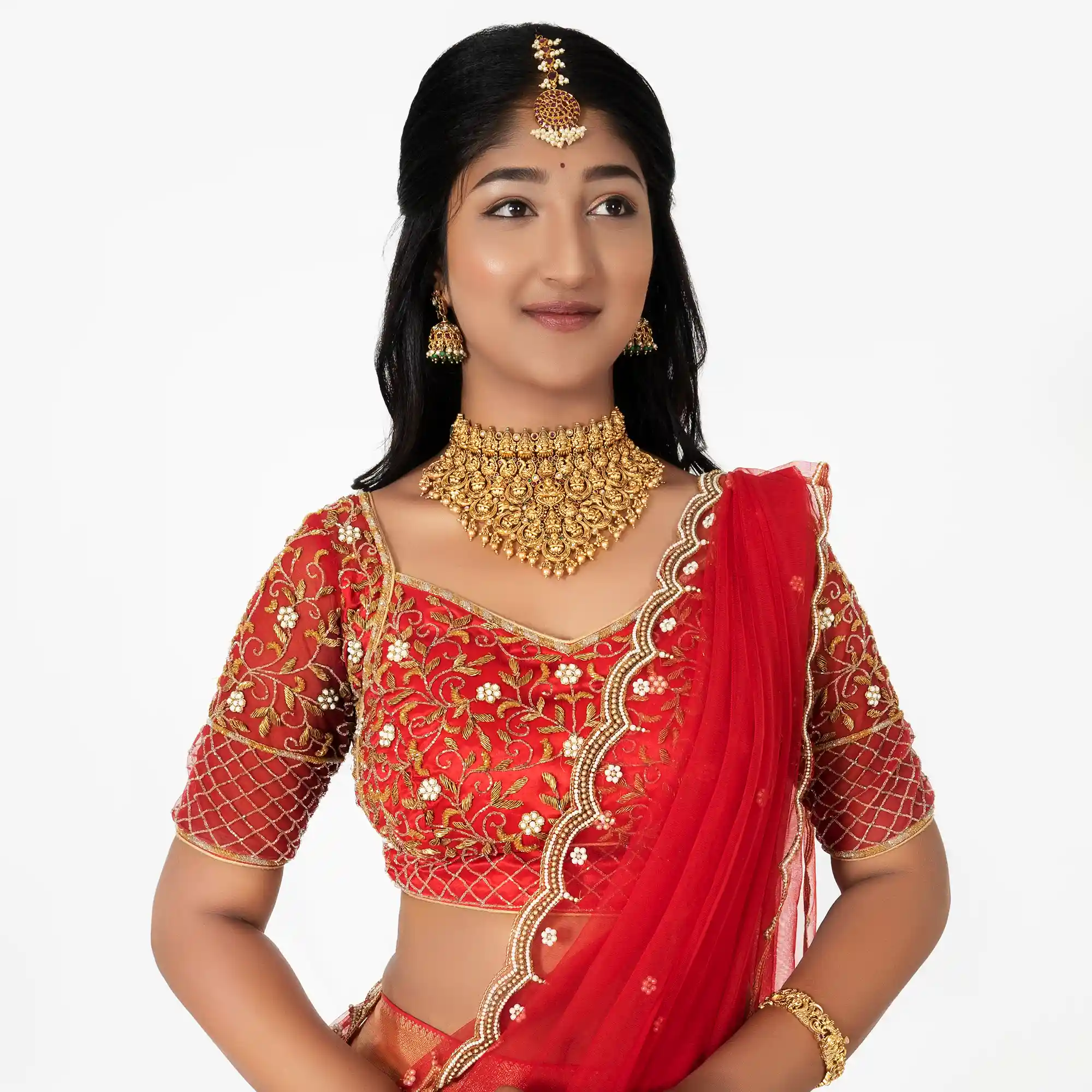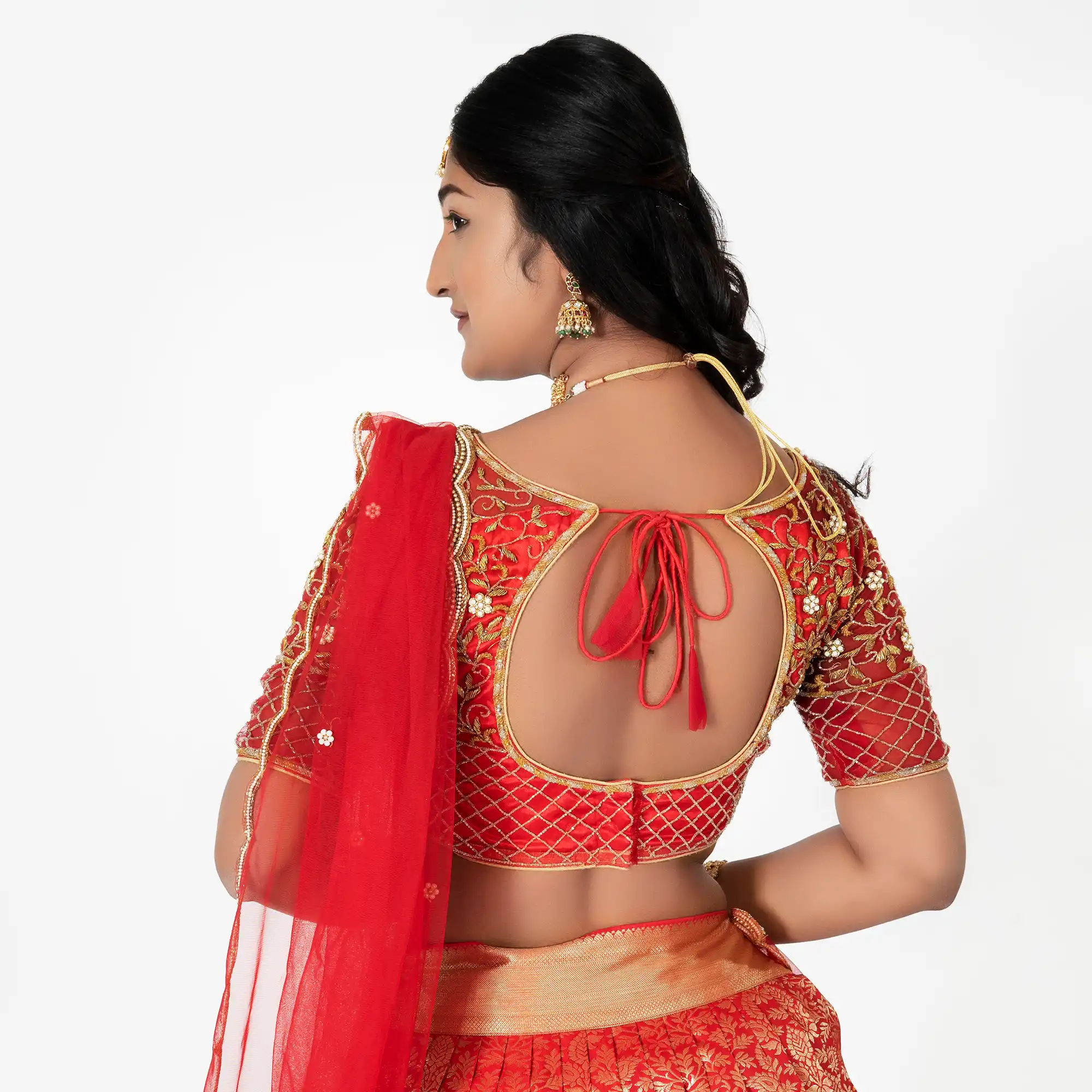 - Blouse: A fitted, short-sleeved choli in deep red. It features an open U-neckline and intricate gold embroidery. The sleeves are finished with a delicate lattice-patterned border.