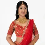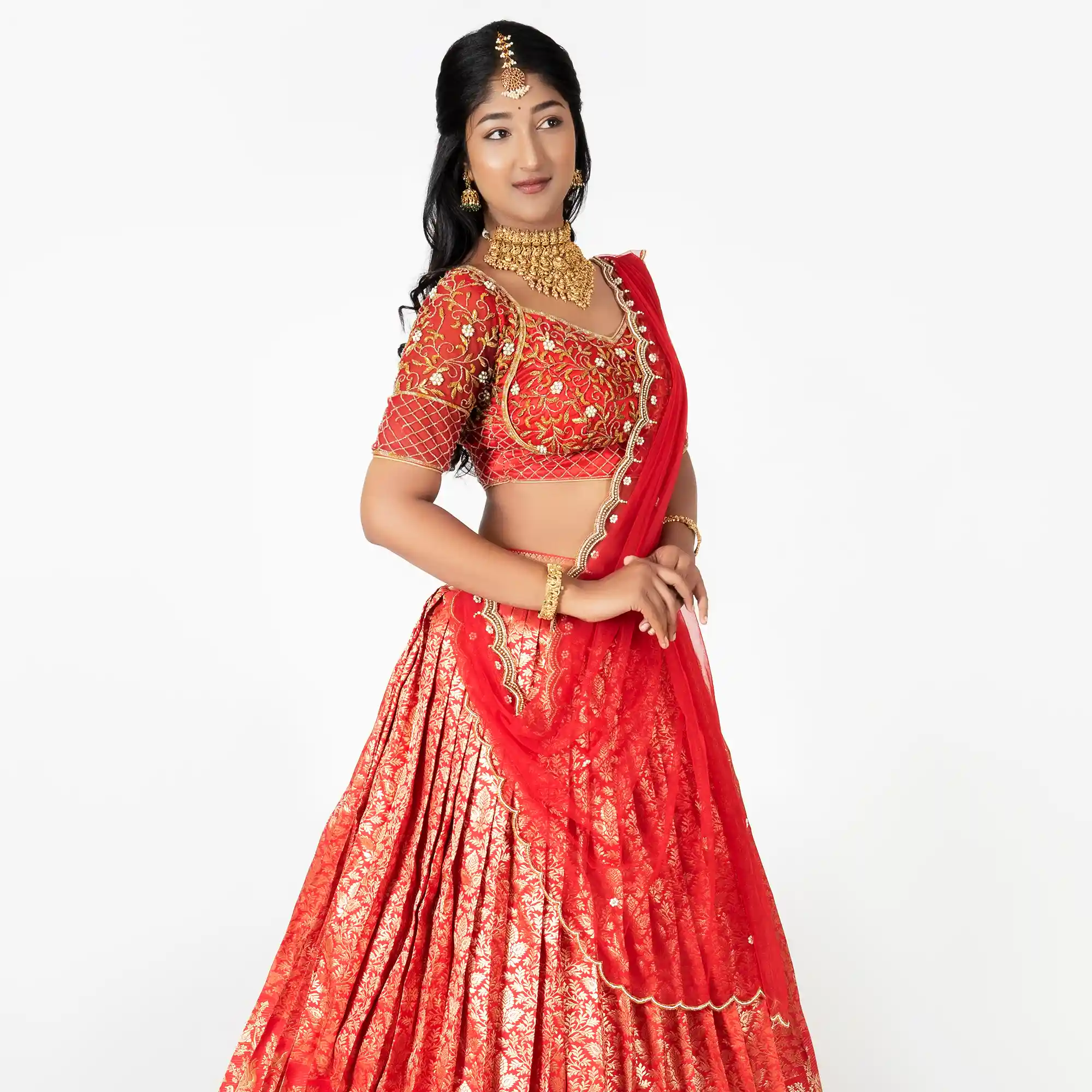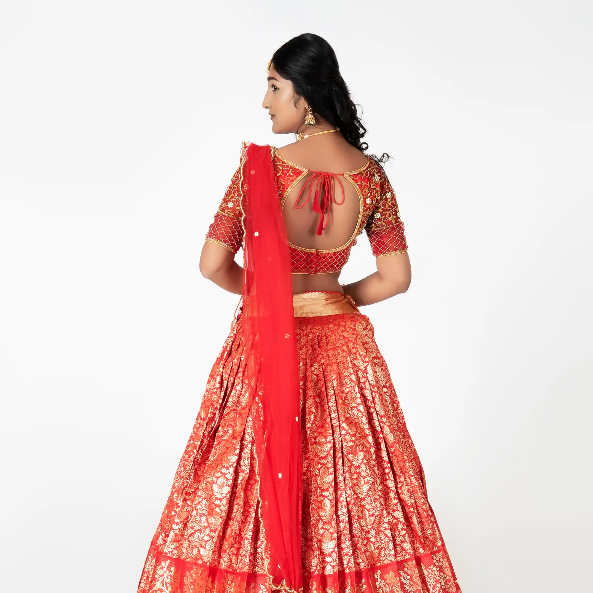 - Dupatta (Voni): A sheer red net dupatta with a scalloped gold-embroidered border. It is draped in the classic half-saree style—tucked at the waist and pinned over the left shoulder.