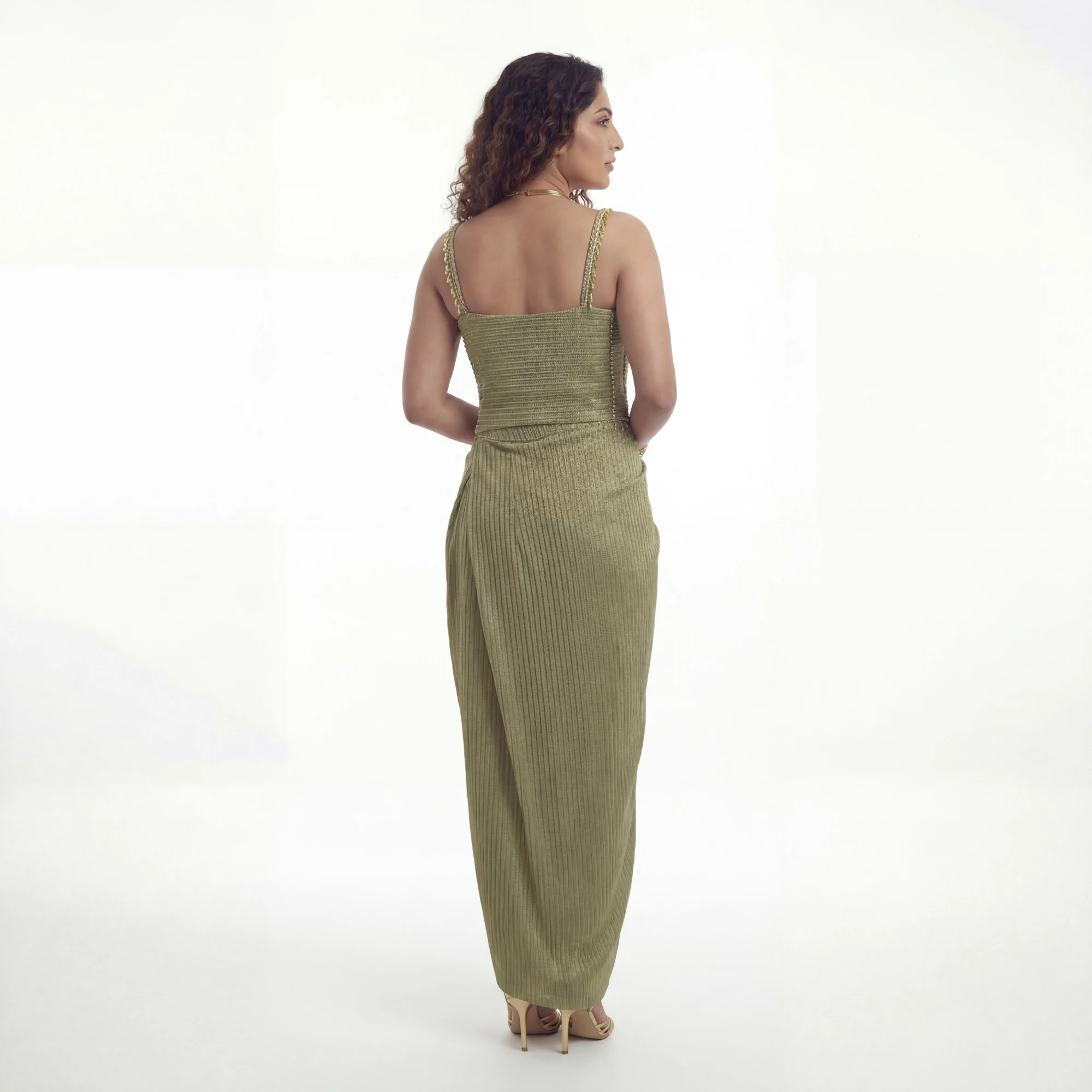 The Draped Skirt: The lower half of the ensemble features a wrap-style draped skirt made from premium, lightweight crepe fabric.