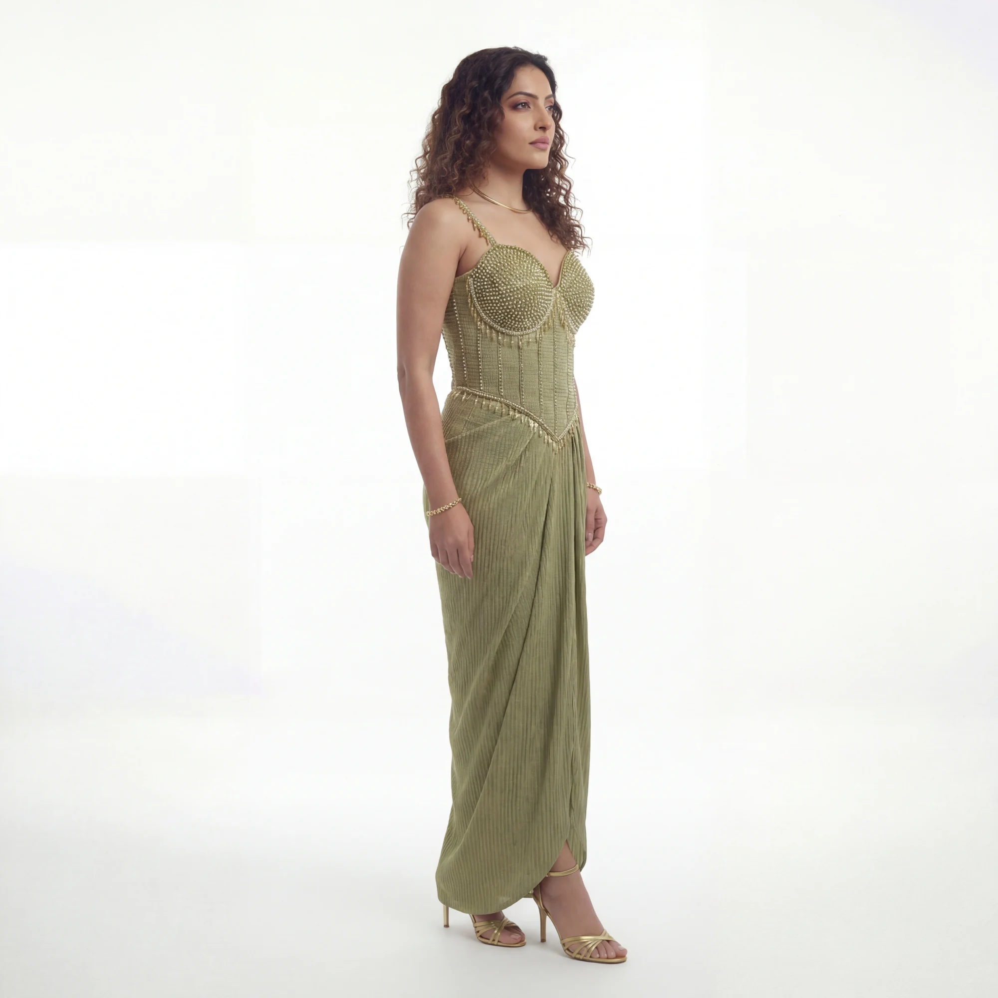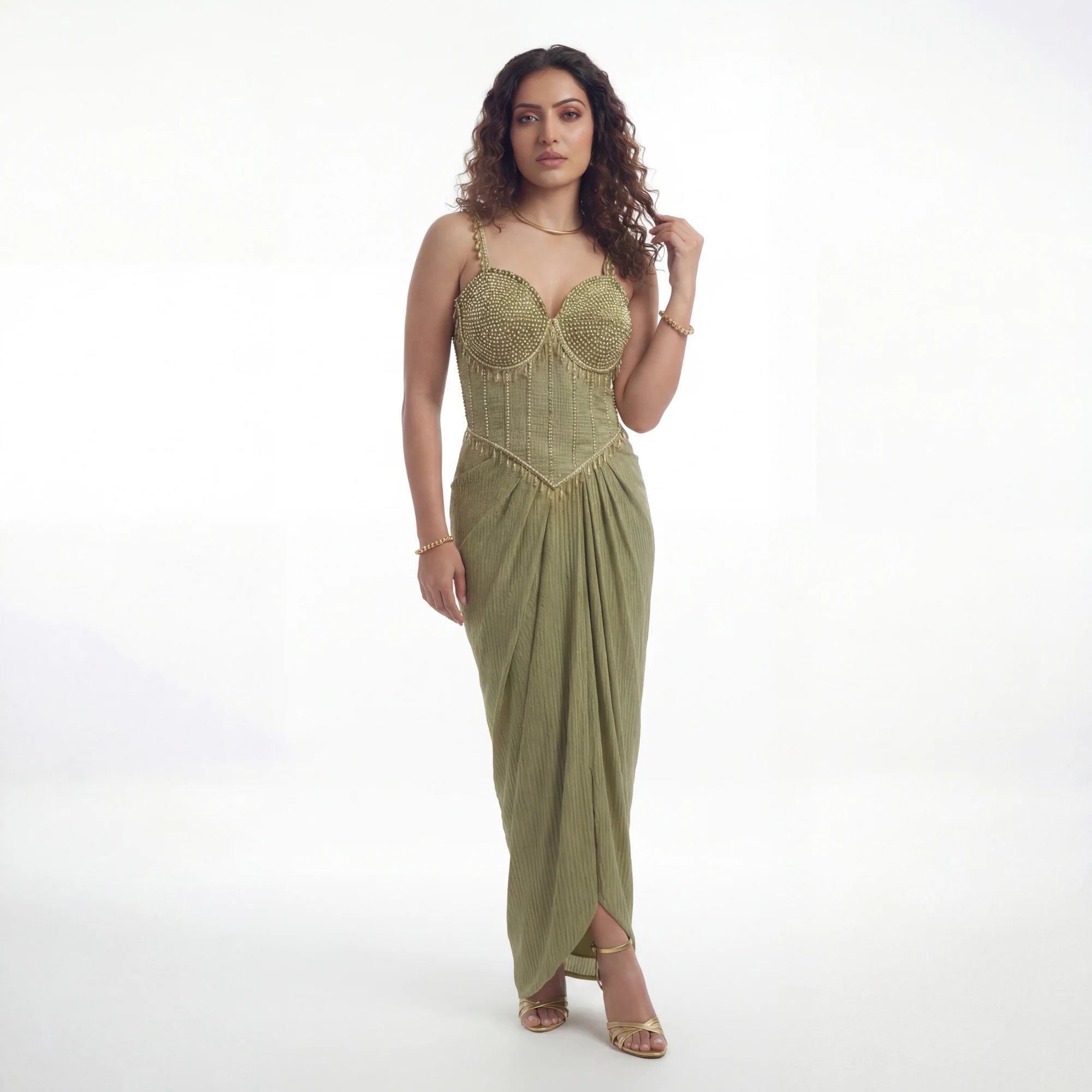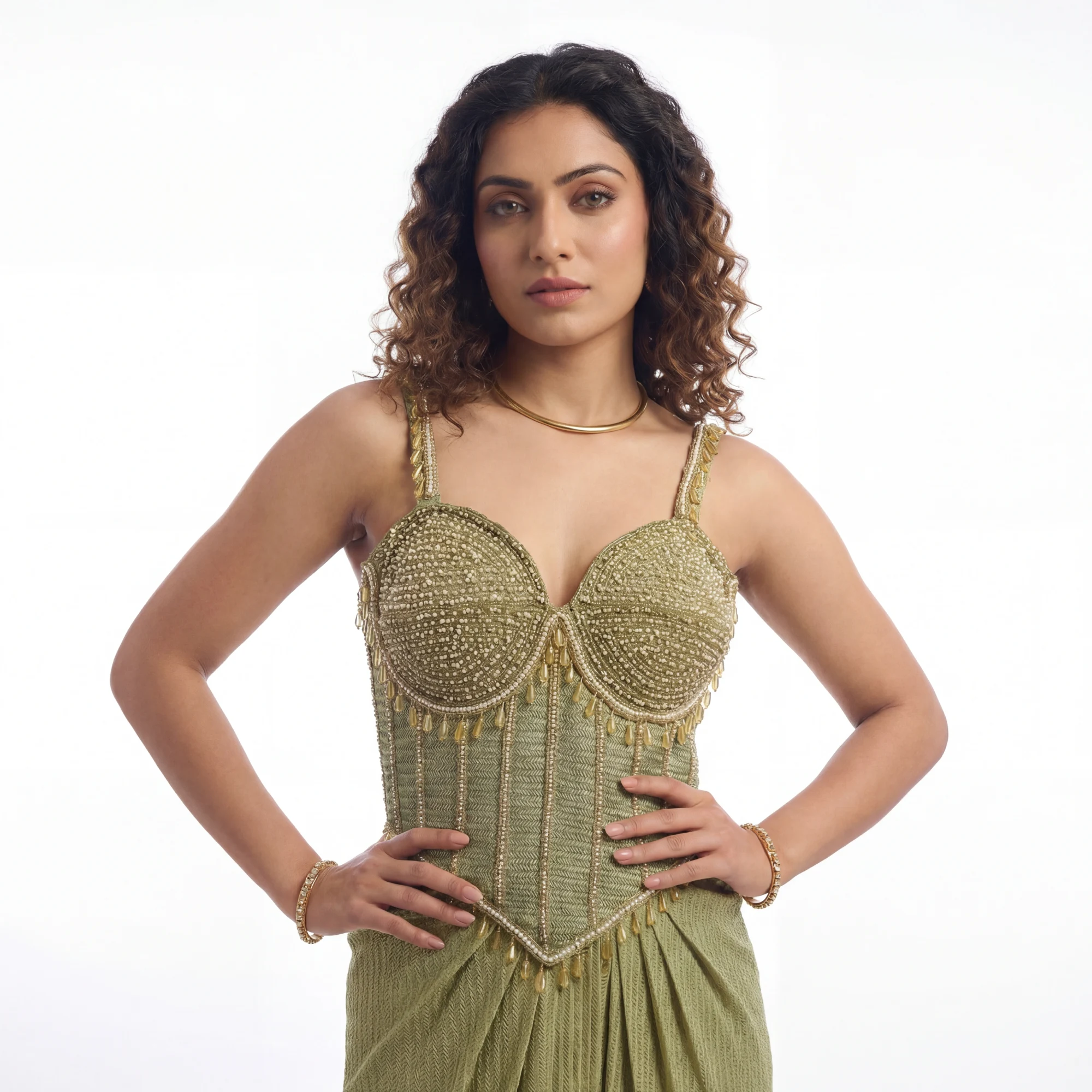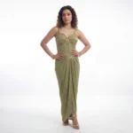 The Sage Gold Embellished Bustier Set is designed for the woman who wants to make a daring yet elegant statement. It showcases the brand’s ability to fuse architectural structure with feminine movement.