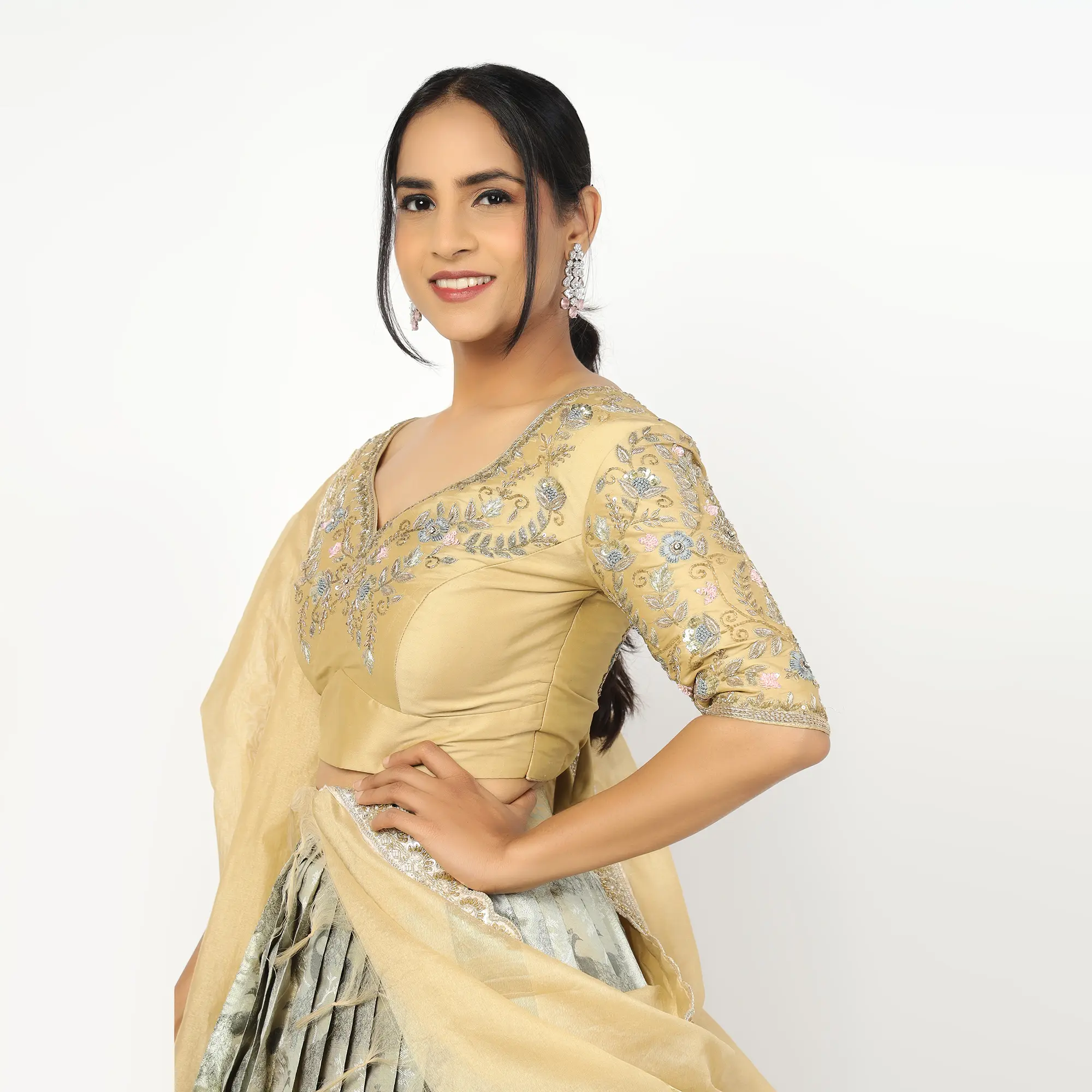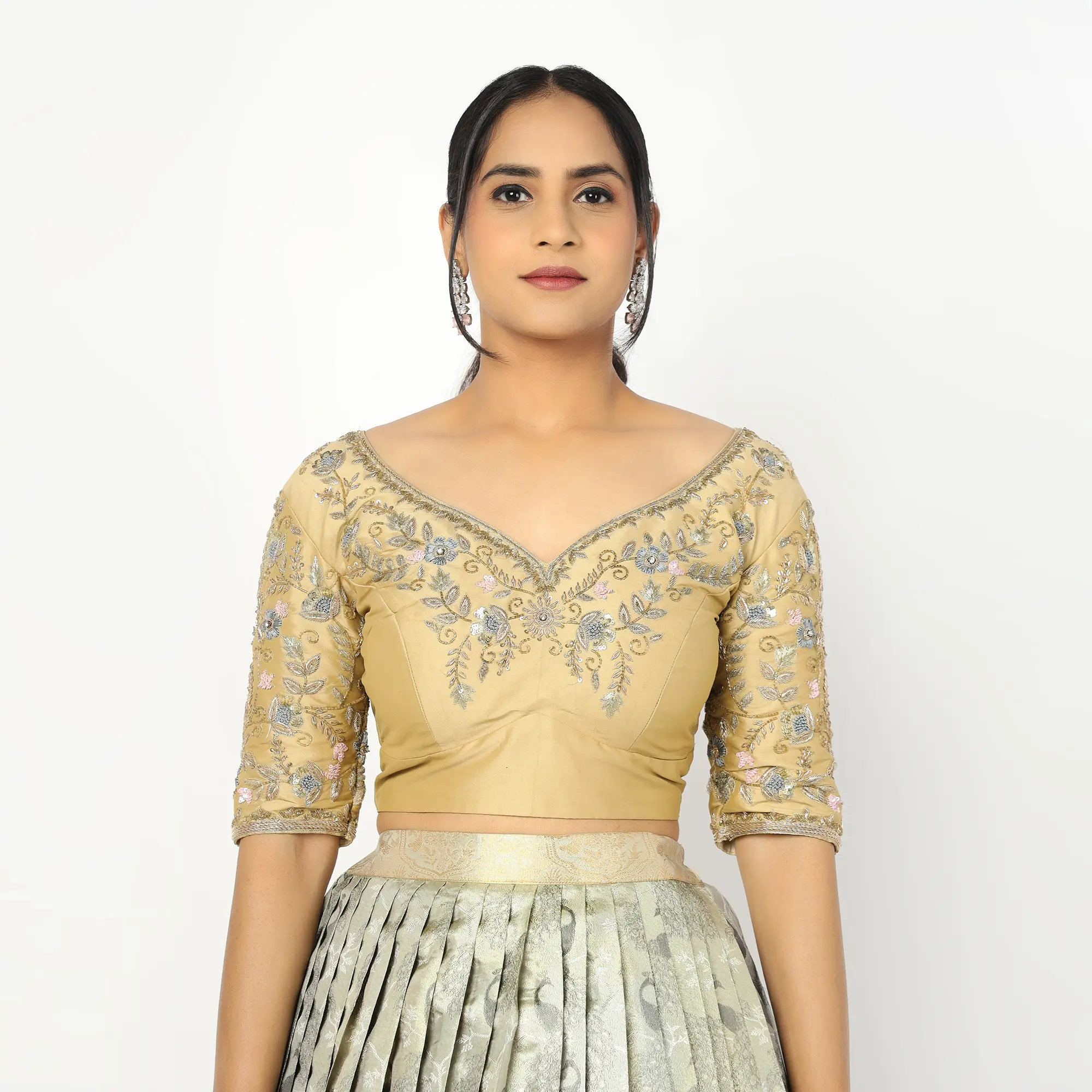 • The Blouse (Choli): The choli is crafted in a luxurious sage gold fabric with a classic V-neckline and elbow-length sleeves. It is heavily adorned with intricate hand-embroidery, featuring delicate silver and pink floral motifs that accent the neckline and sleeves.