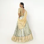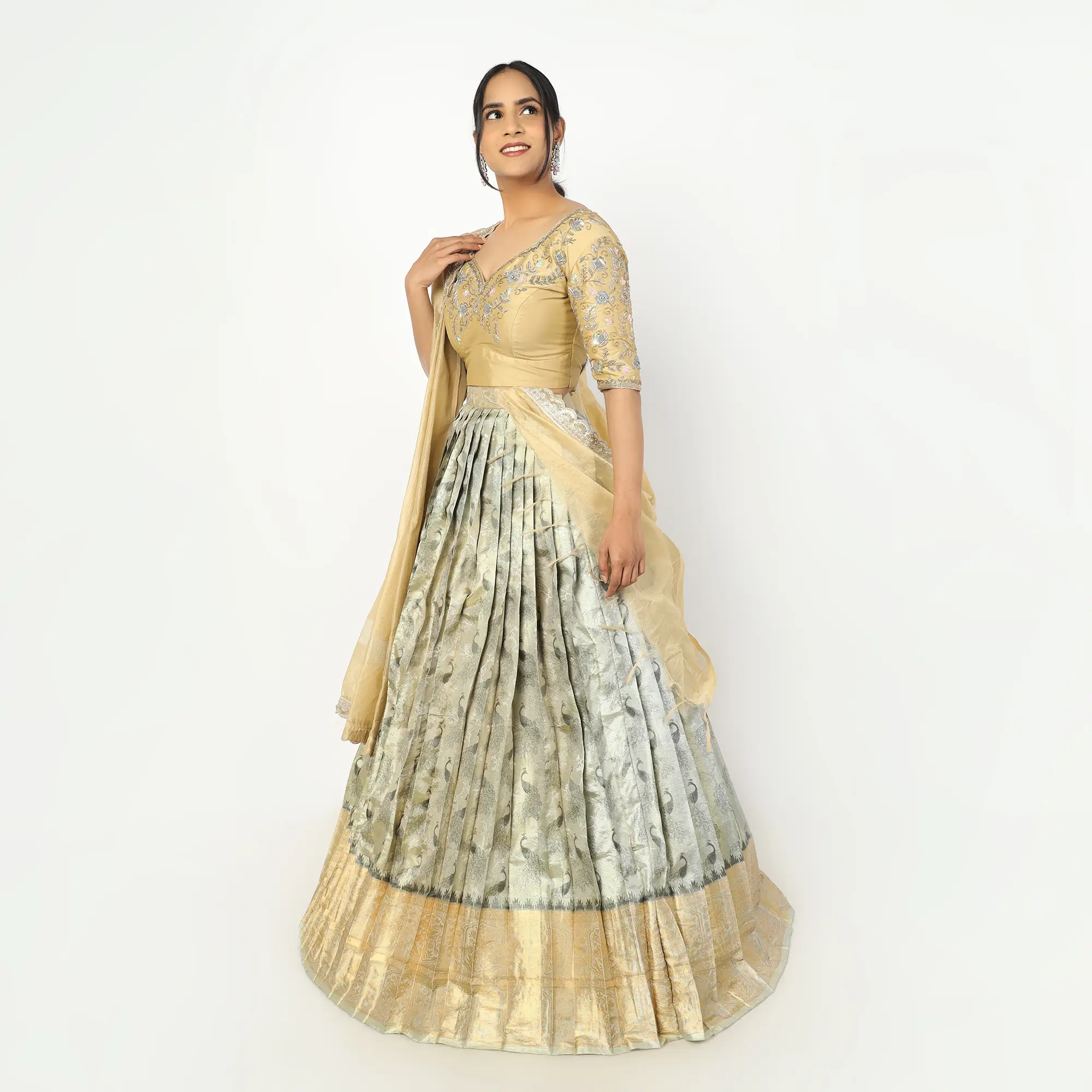 An exquisite half saree featuring a hand-embroidered sage gold blouse and a voluminous, box-pleated silver-sage brocade lehenga finished with a traditional wide gold zari border.