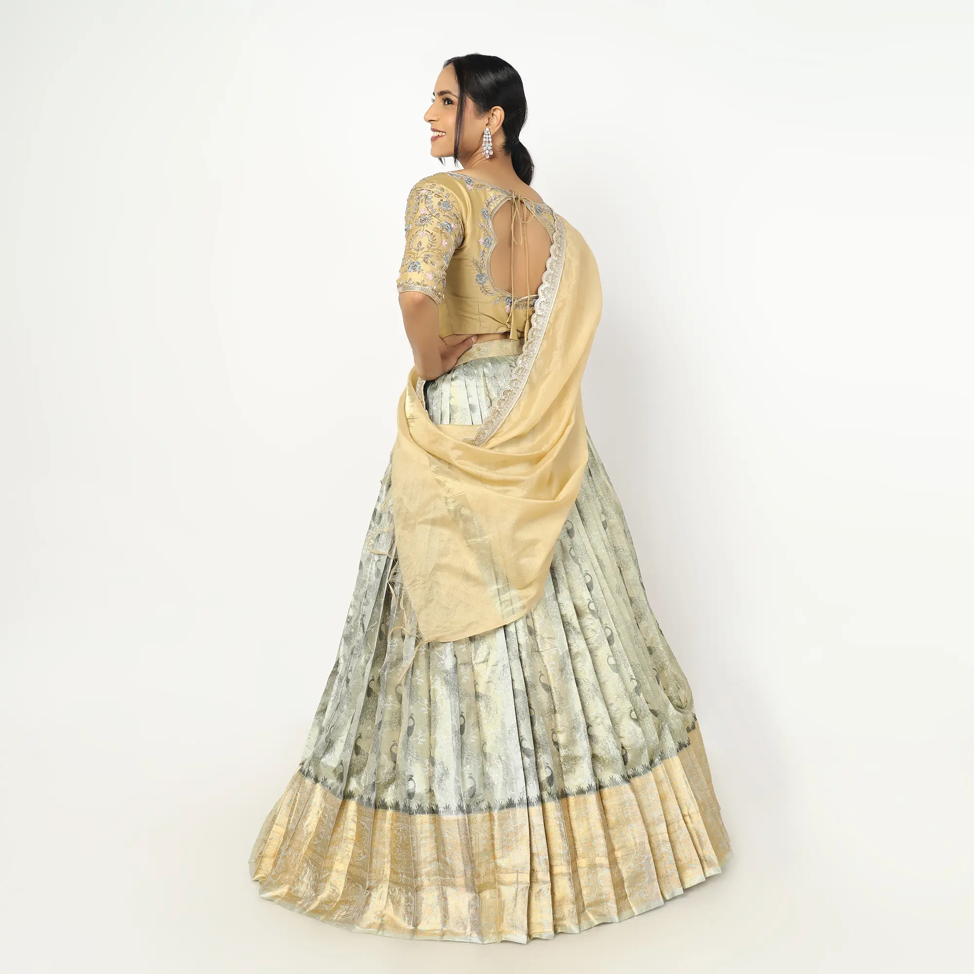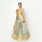 • The Voni (Dupatta): Completing the set is a matching sage gold voni with a shimmering texture. It is framed by a signature gold scalloped lace border, designed to be draped in a classic South Indian style that beautifully ties the metallic palette together.
