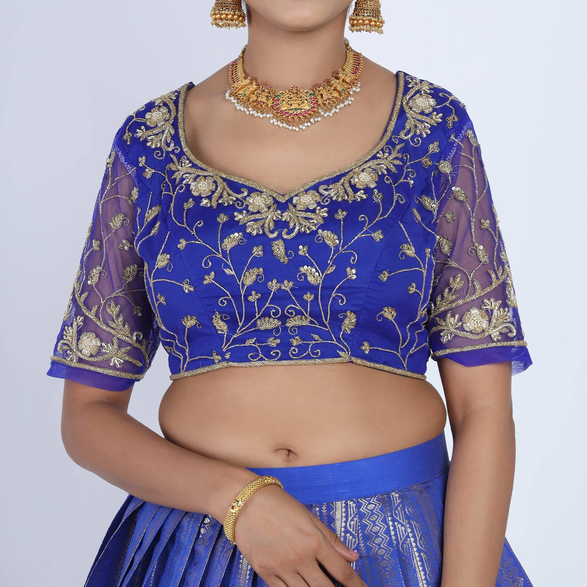 The Blouse (Choli): The bodice is crafted in a rich teal blue fabric with a classic round neckline and elbow-length sleeves. It is the focal point of the set, featuring dense gold zari hand-embroidery in intricate floral patterns, while the sleeves are accented with a sophisticated diamond-lattice (jali) threadwork and finished with a delicate gold scalloped lace.