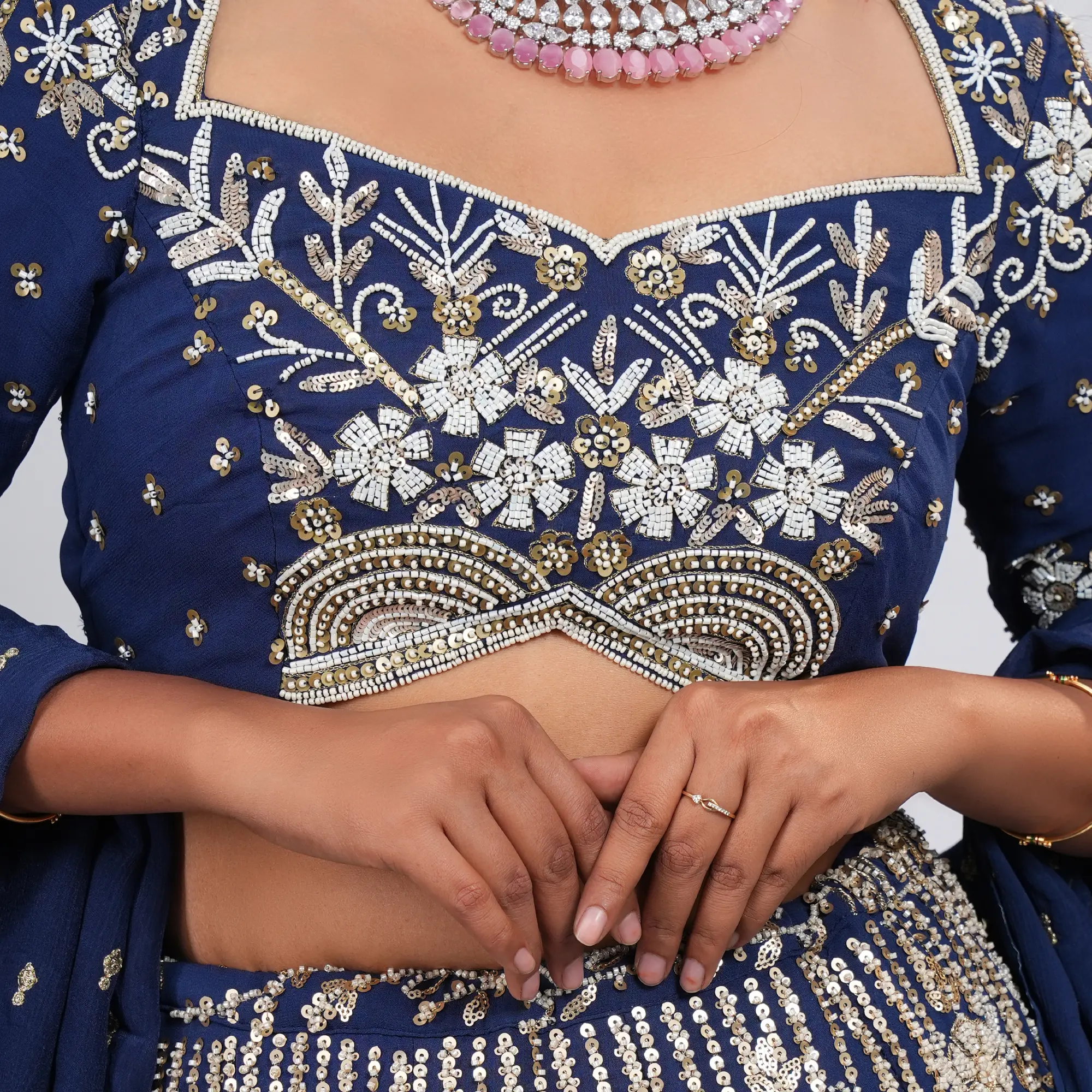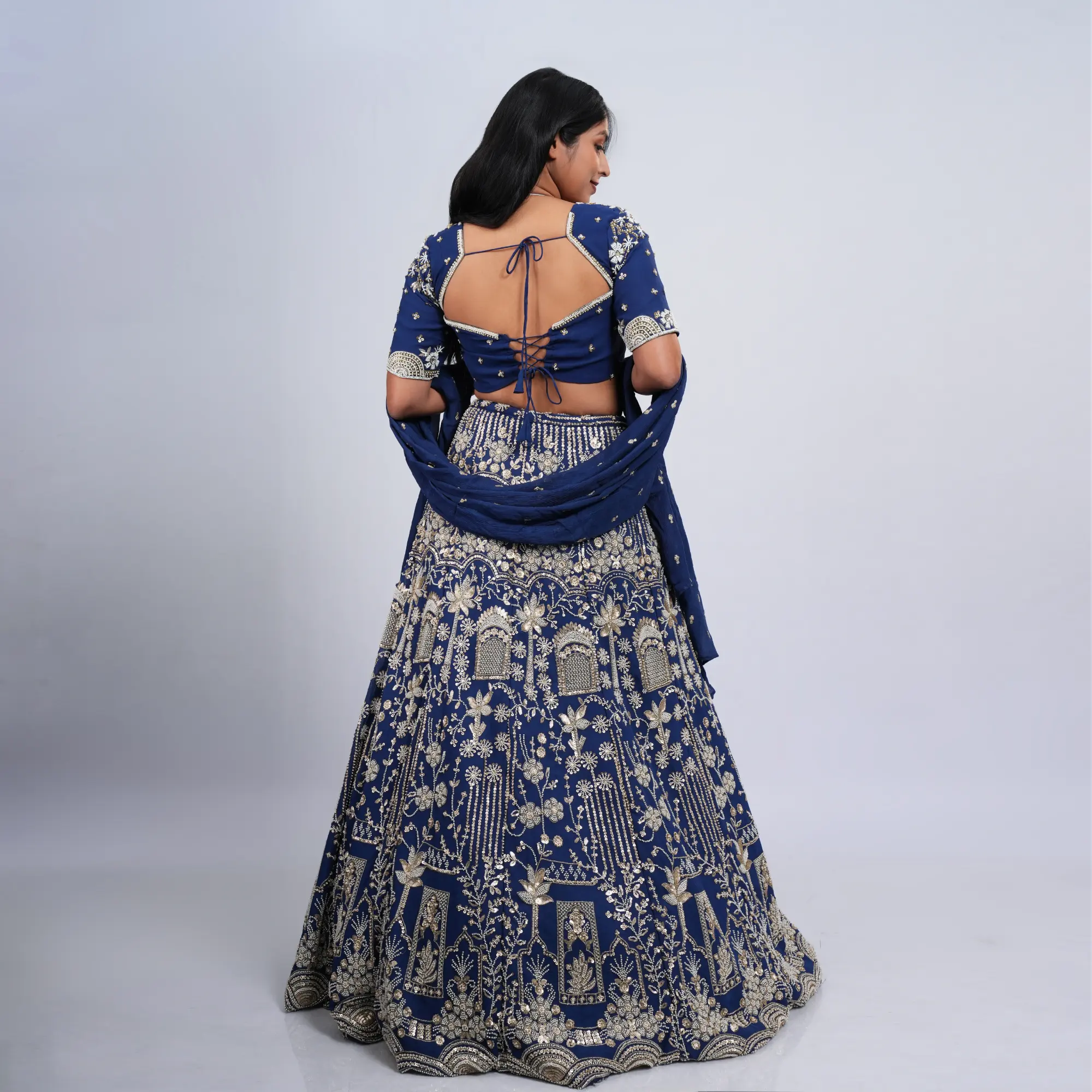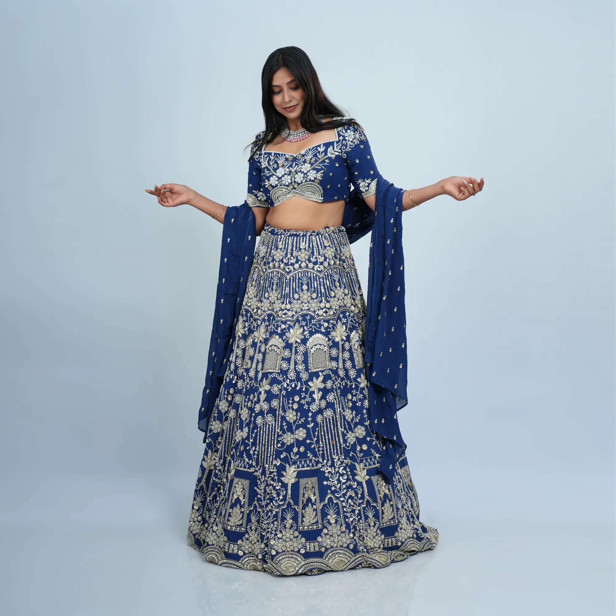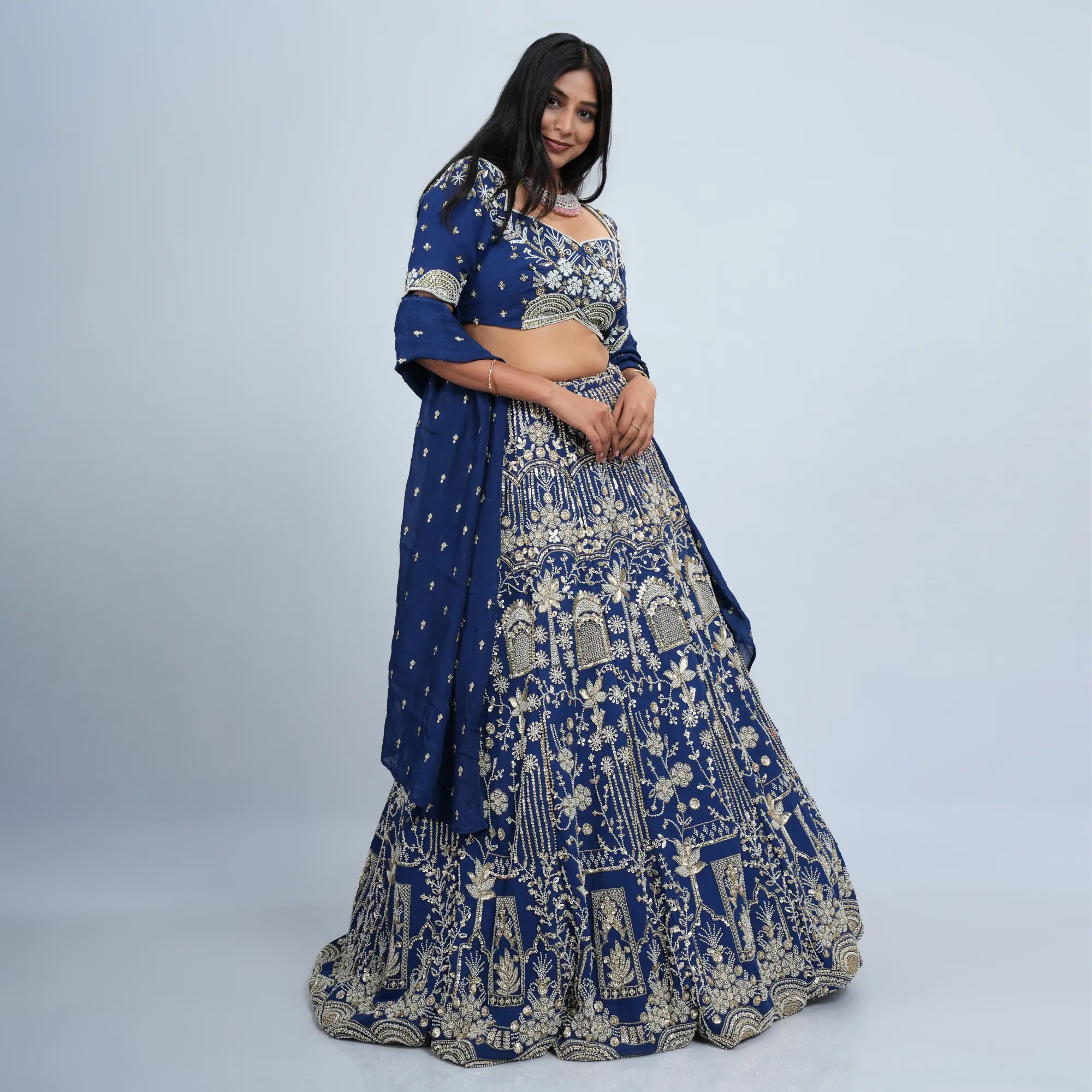 • Fabric: High-grade Brocade Silk for the skirt and silk-blend for the choli with a sheer embroidered dupatta.