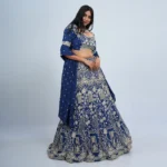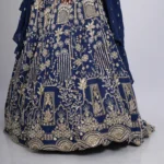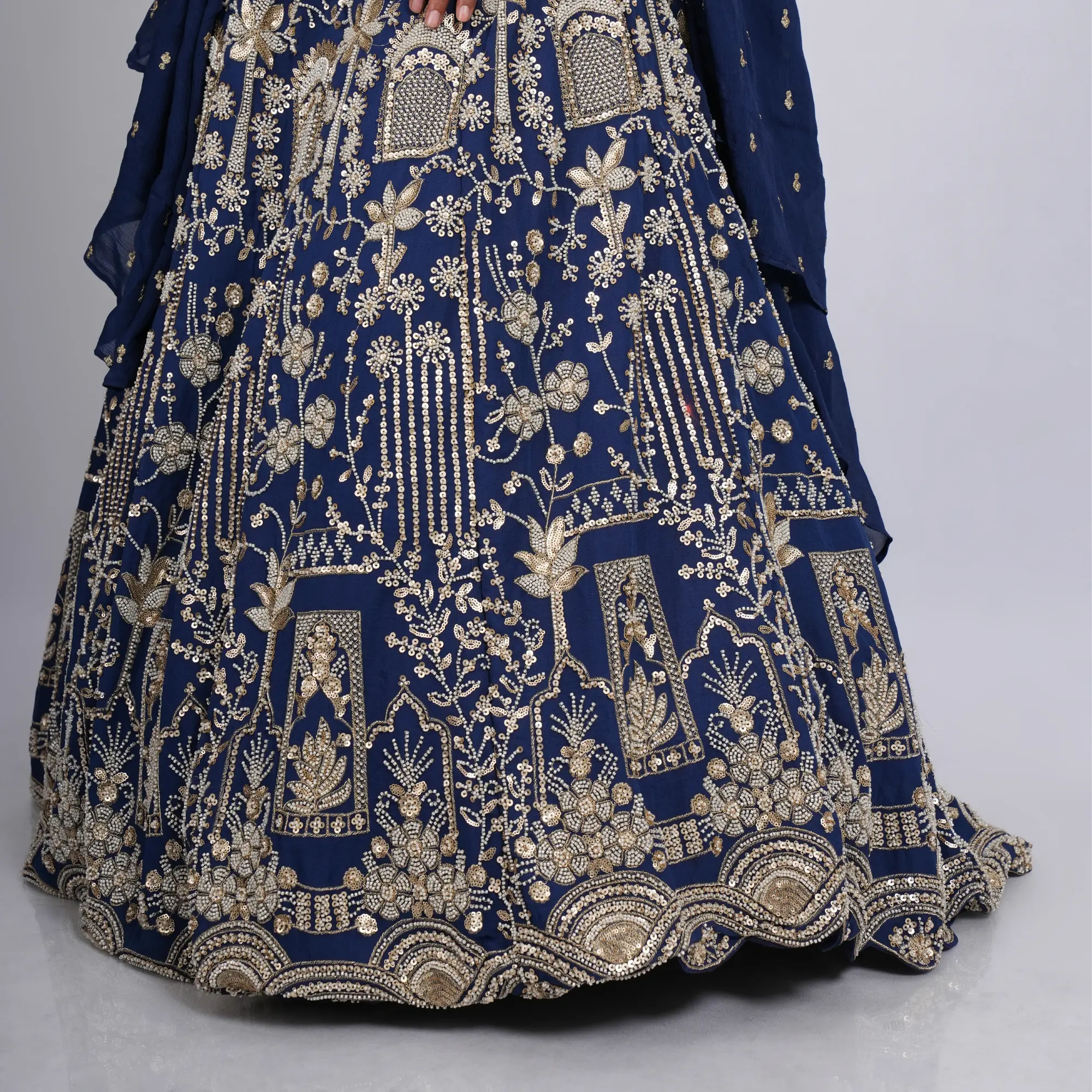 • The Lehenga (Skirt): The floor-length skirt is crafted from premium champagne-gold brocade silk, showcasing an all-over traditional floral weave. It is defined by its wide, traditional copper-gold zari border at the hem, which adds weight and a majestic fall to the vertical pleats.