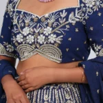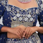 • The Blouse (Choli): The deep wine-purple blouse features elbow-length sheer sleeves and a classic sweetheart neckline. It is delicately hand-embroidered with gold zari along the neckline and sleeve cuffs, providing a regal contrast to the rich fabric.